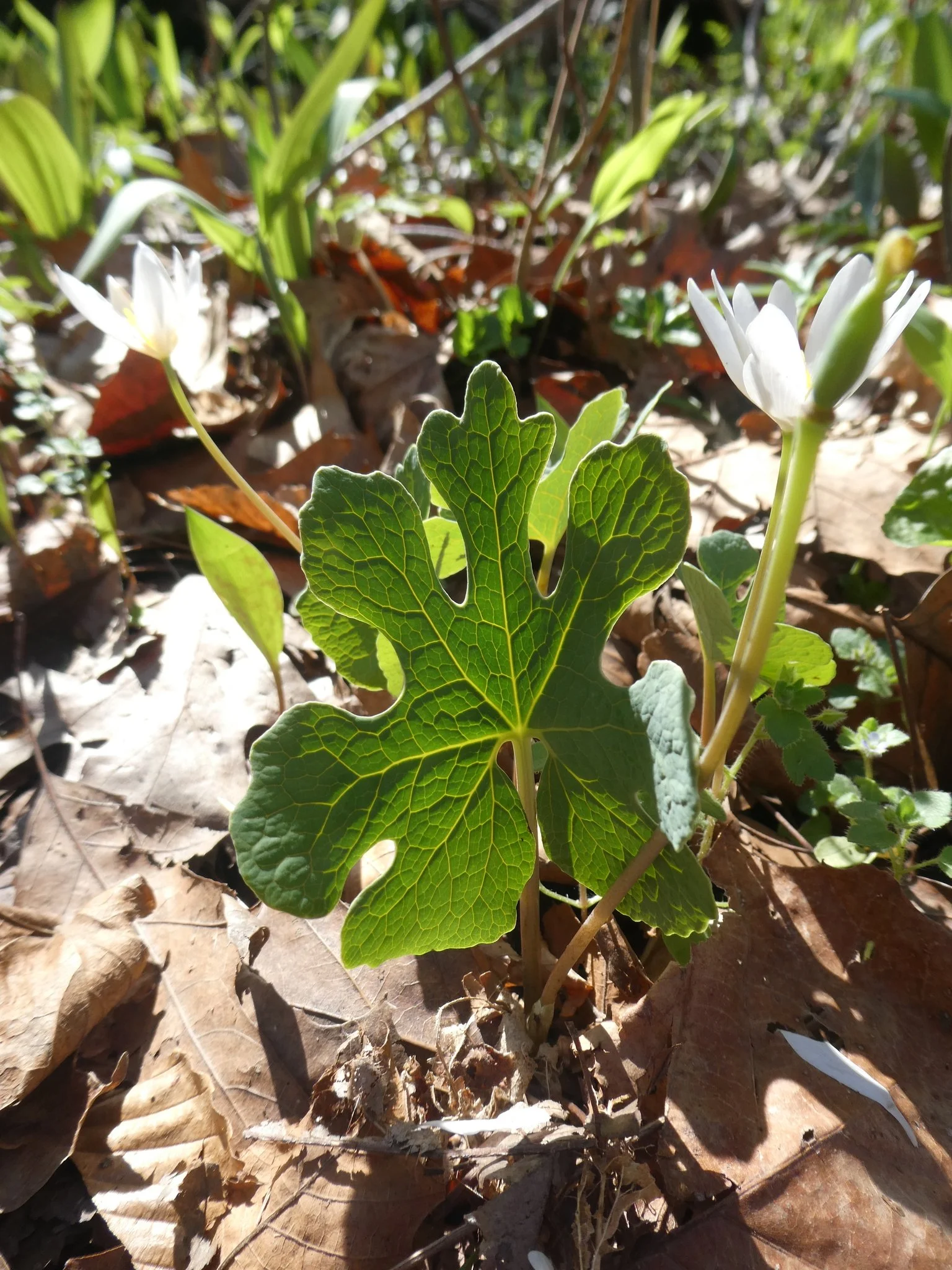 The leaves open up around the same time as the flowers, and have an unusual but still attractive shape. They can grow up to 6 inches across and have 3 to 9 lobes. Foliage may go dormant by mid-summer, but bloodroot leaves can be seen into September and even October.