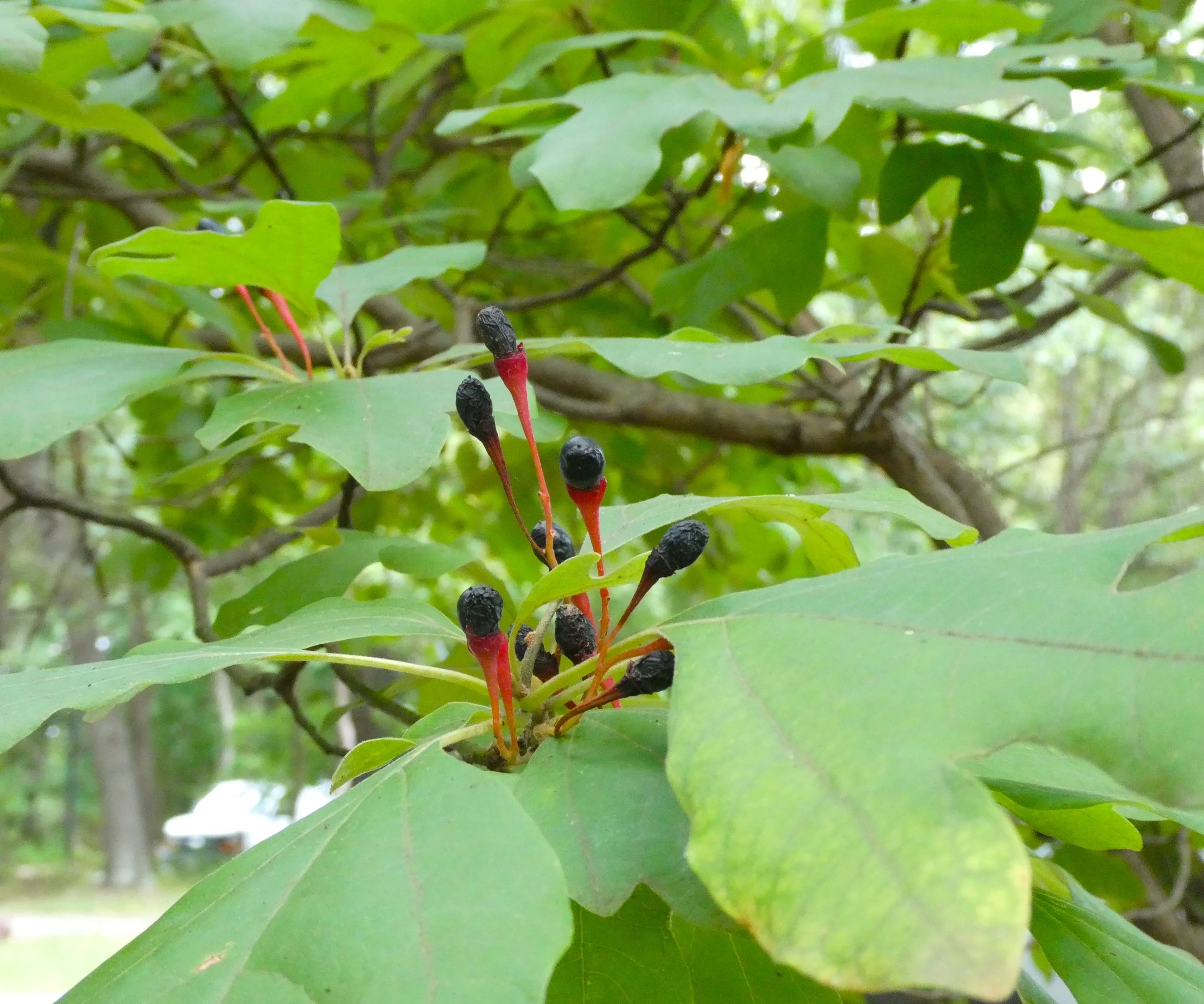 Sassafras is a unique tree with many interesting features, from the bark to leaves to berries. A member of the Lauraceae (Laurel) family, it also has aromatic properties and was traditionally used culinarily. Its roots were used for root beer flavoring, leaves for tea, and stems for a gumbo-thickening agent (filé). Recently, the oils in Sassafras have been determined to contain a carcinogenic compound (safrole) so many of its uses have been banned.