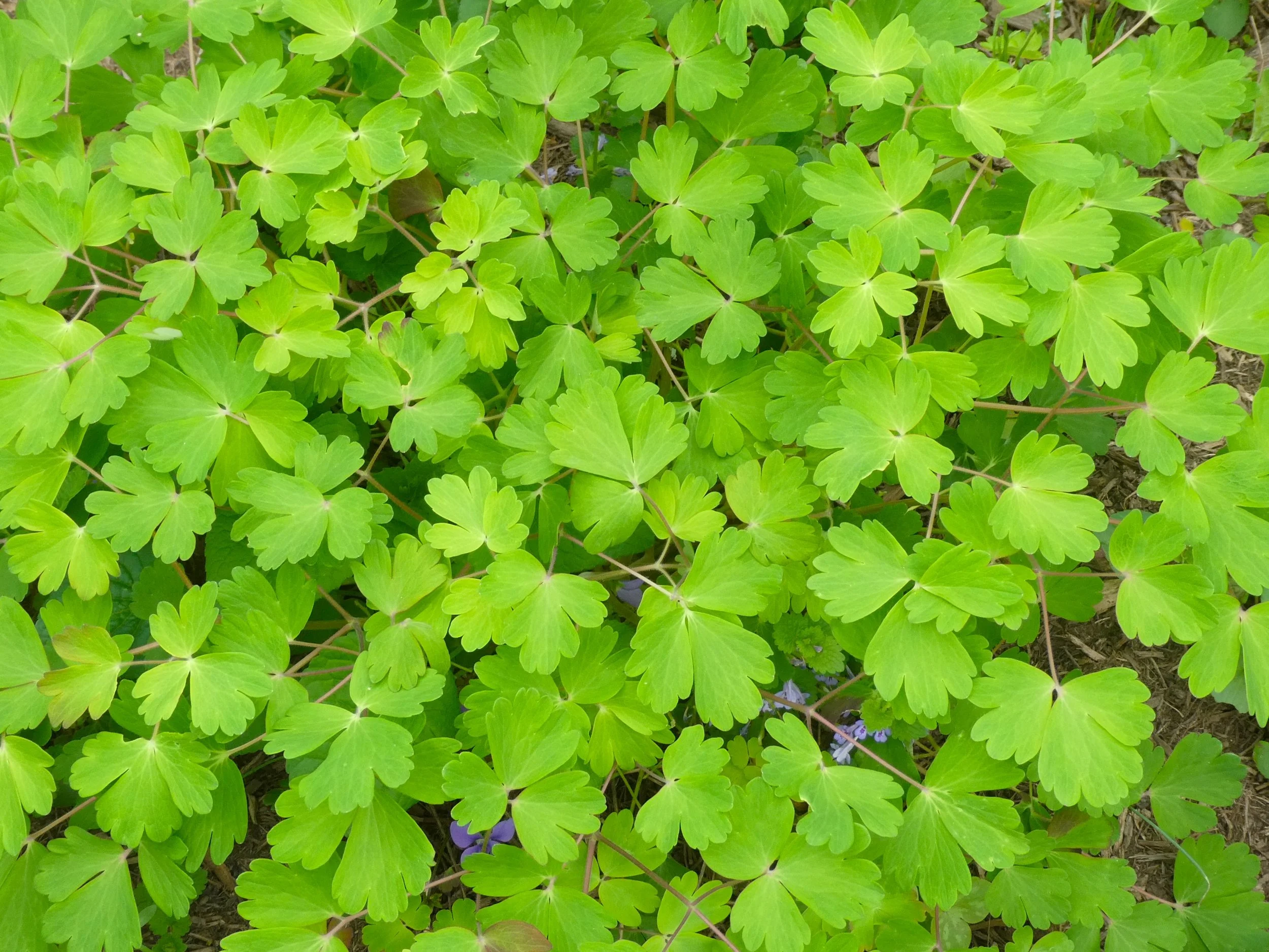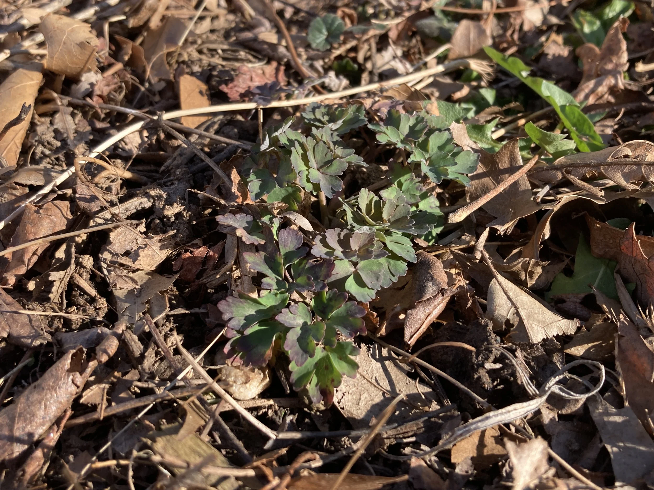 The leaves of Columbine are rounded and divided into three leaflets. Individual leaflets are dissected resembling Meadow Rues (Thalictrum). Foliage will go dormant in the winter, but late winter and early spring foliage has a purple hue to it. It is the larval host for the Columbine Duskywing as well as other various moth species.