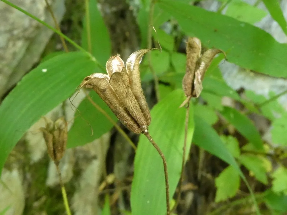 After blooming, seed capsules turn upright in the summer and mature to a tan or light brown color. Inside the capsules are tens of tiny black seeds. Red Columbine can gently spread around the location of the parent plant when these seeds fall out of the capsule. To encourage spread to other garden areas, you can pinch the capsules and the seeds will fall into your hand or a bag, where you can distribute them. Some songbirds may eat a portion of the seeds.