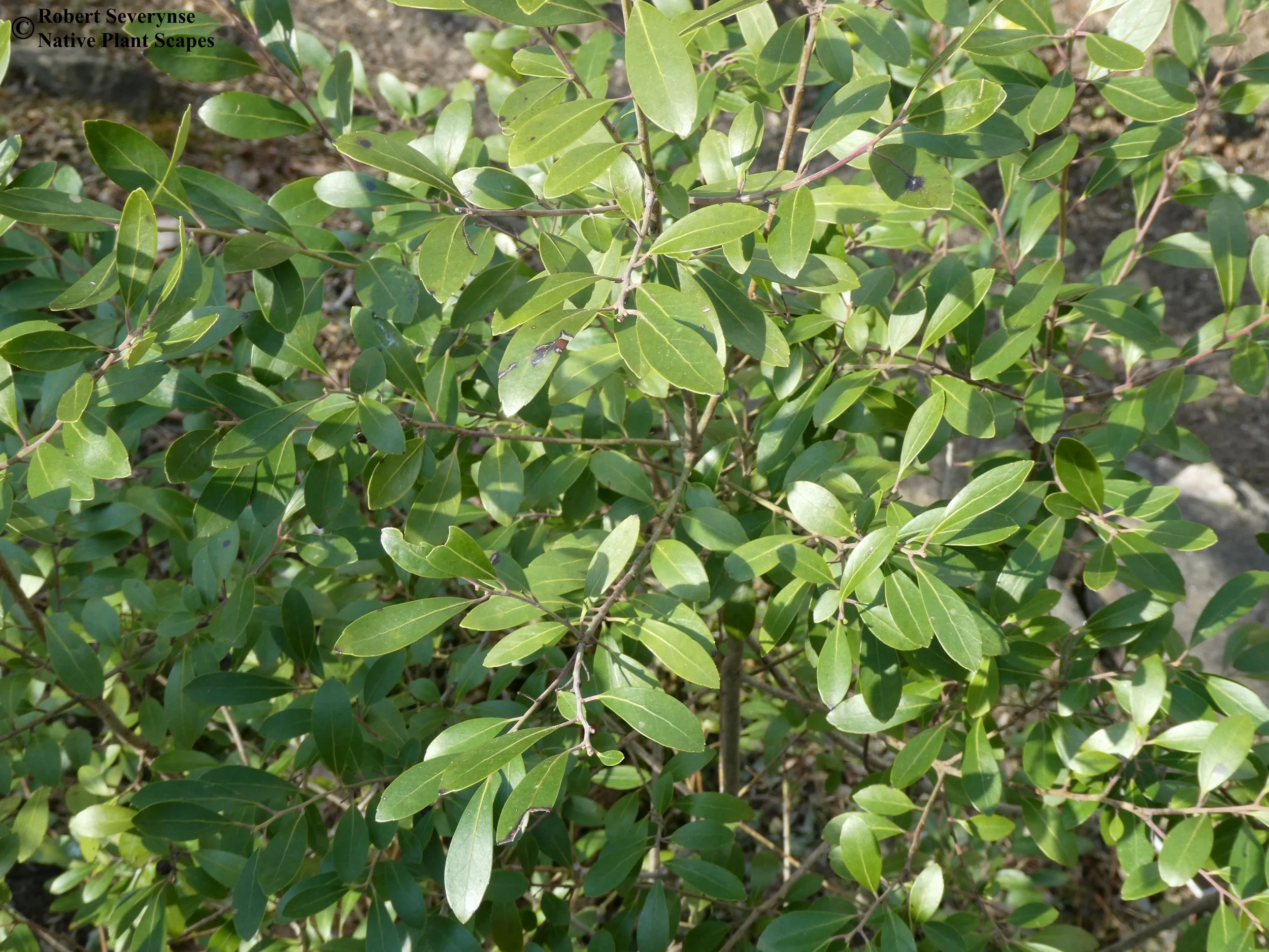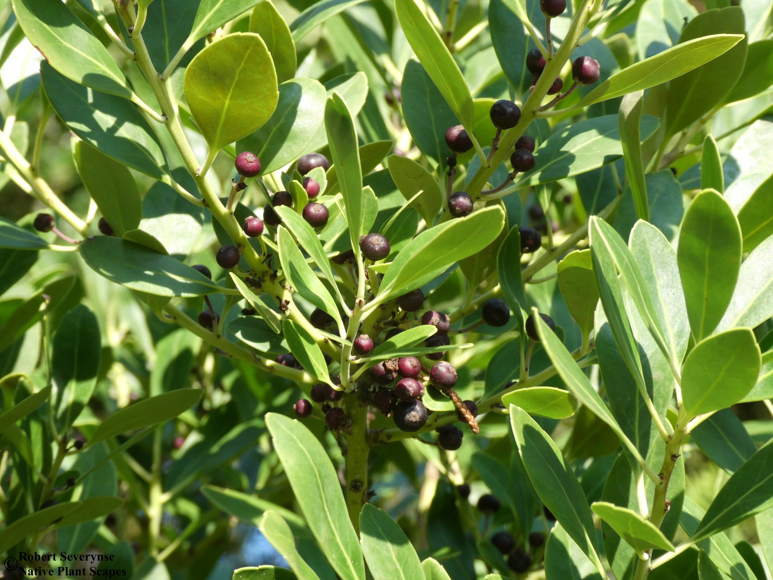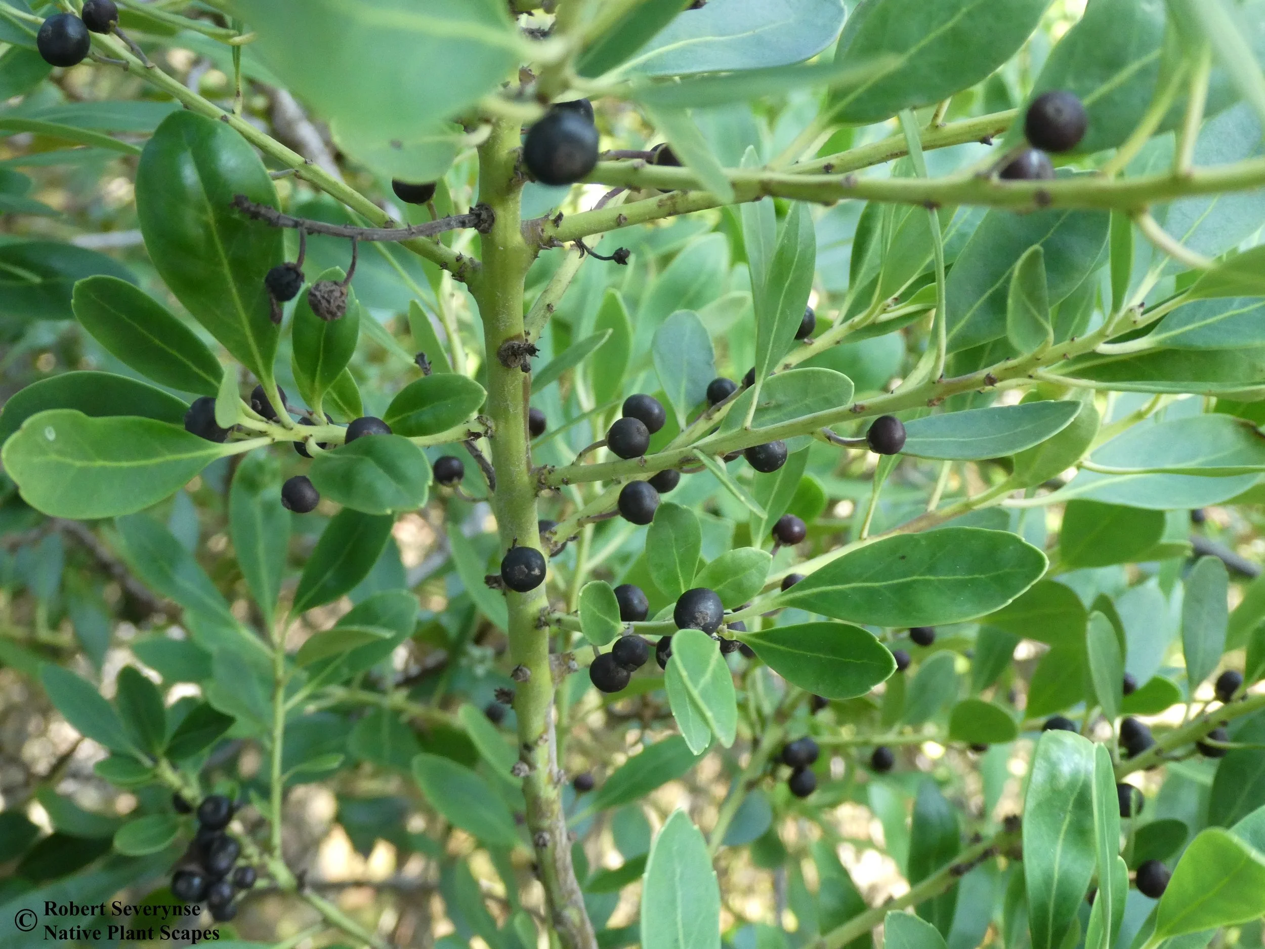 Inkberry provides year round cover for wildlife. Flowers are a pollen and nectar source. Various species of birds will consume the fruits in the winter. Larval host to the Henry's Elfin butterfly and a few other species of caterpillars.
