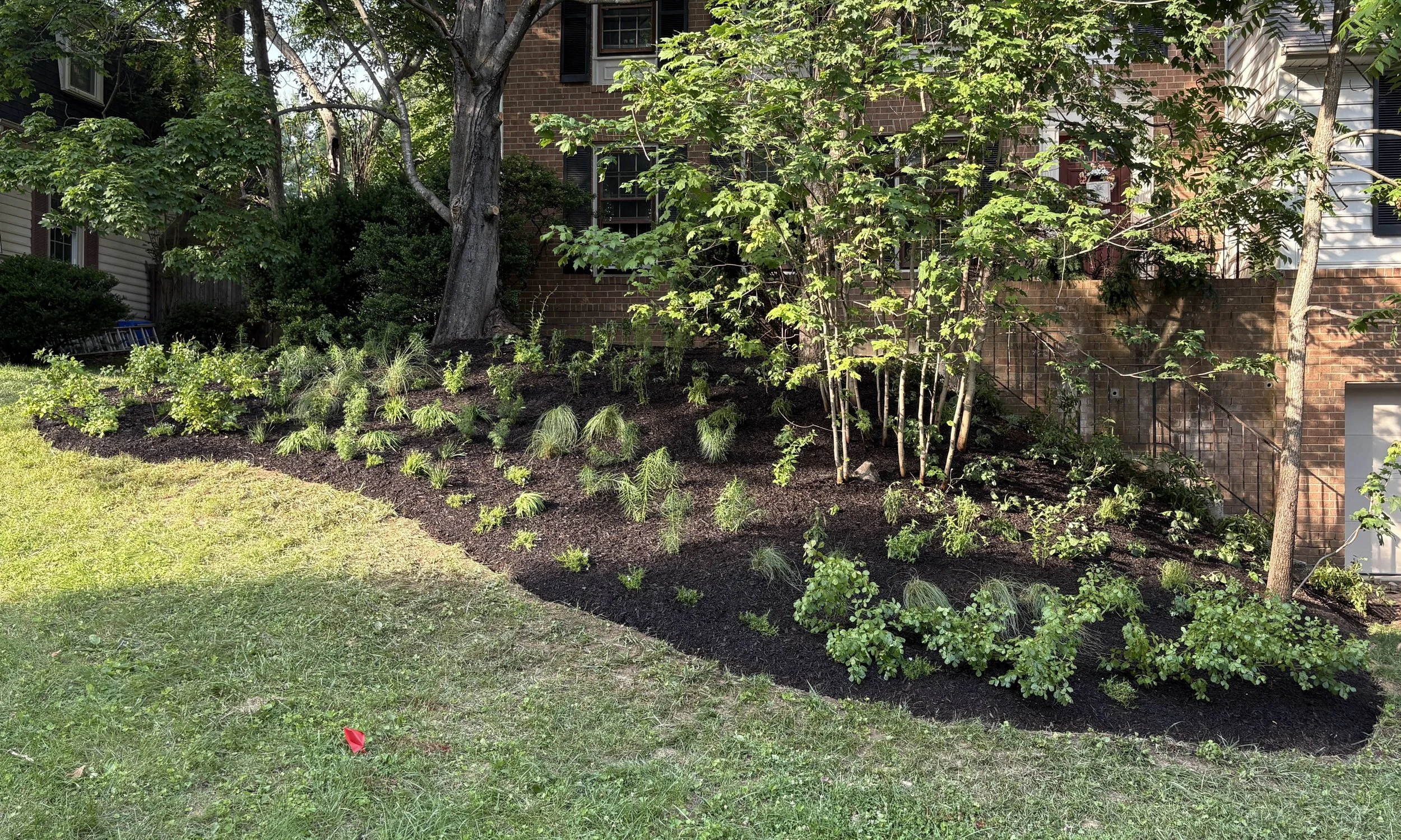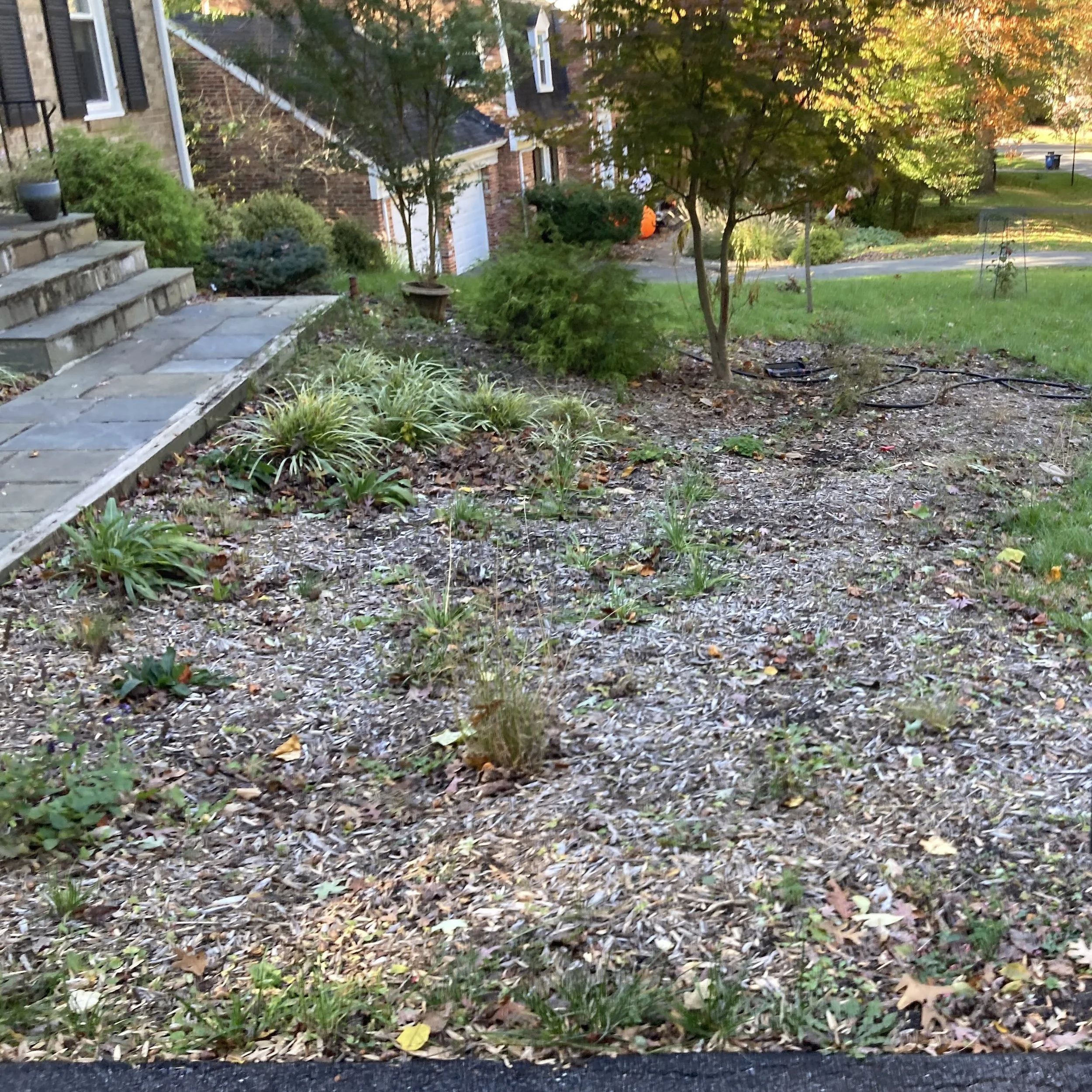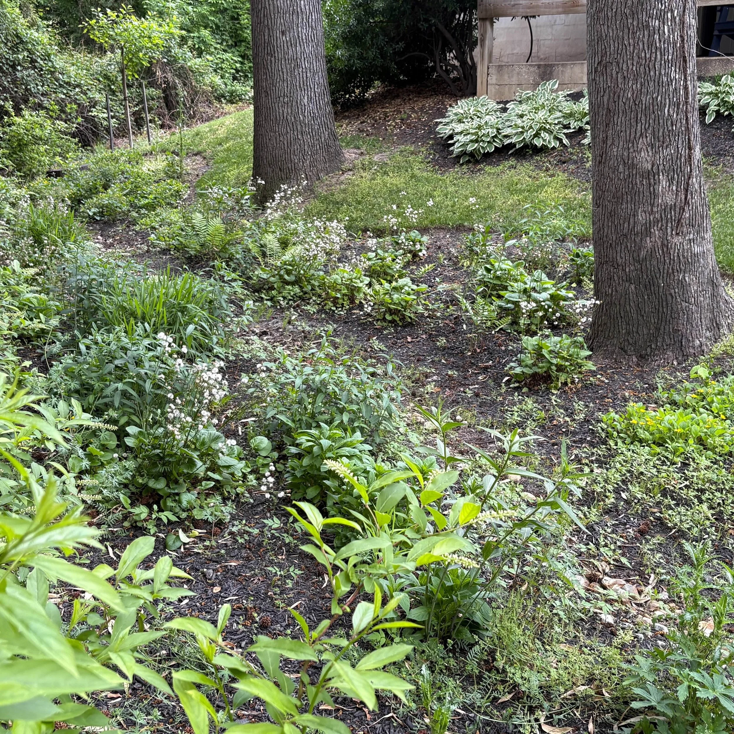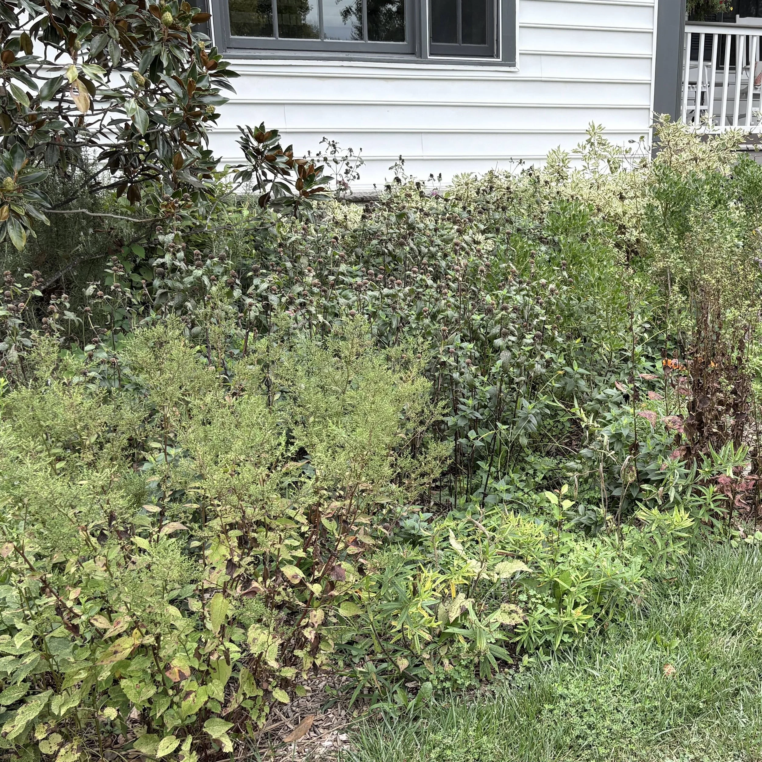 Several plant species dominated and took over the existing garden space. These aggressive plants outcompeted others to create a space with an overly wild appearance. We cleared out all of the vegetation and planted low maintenance native plants that are not aggressive.