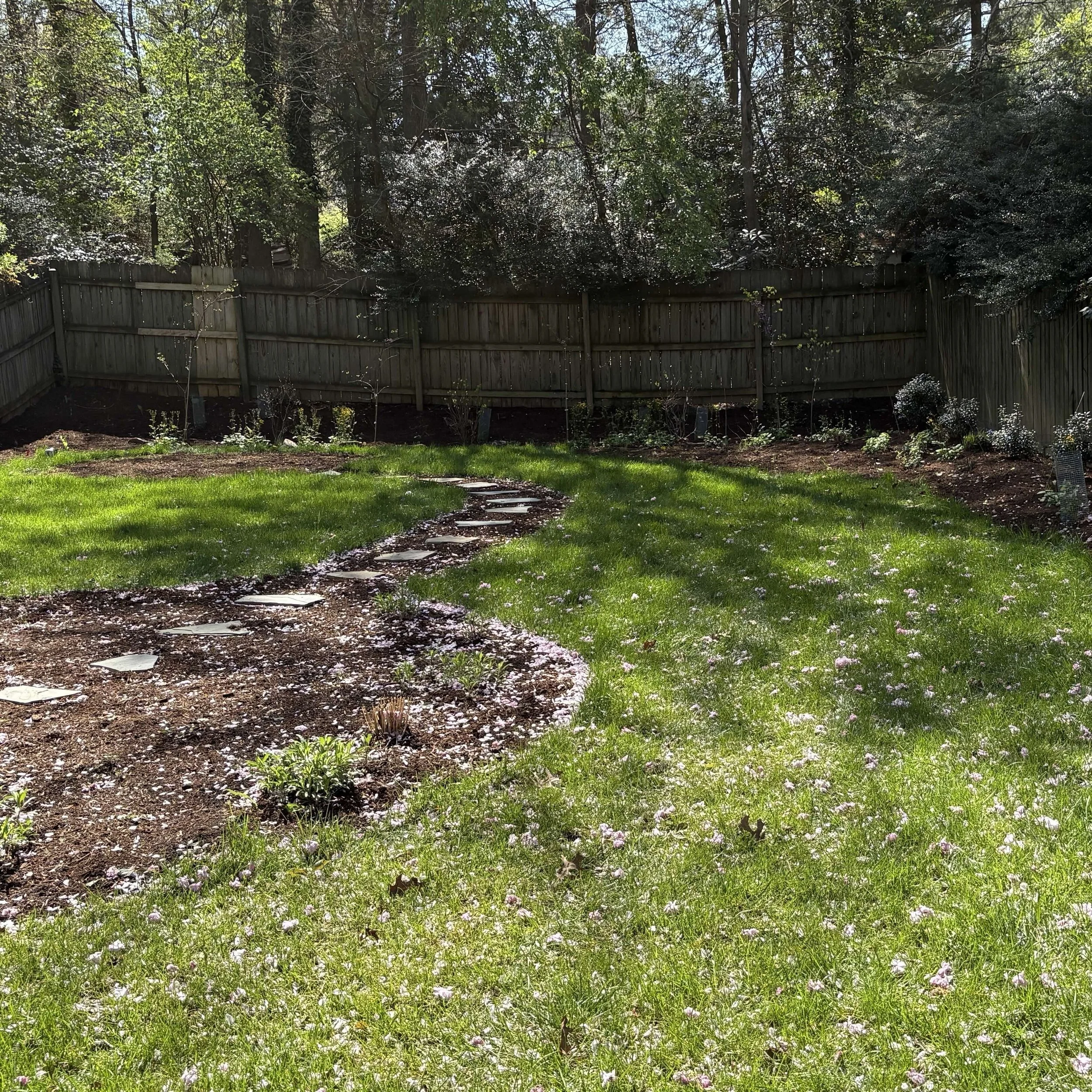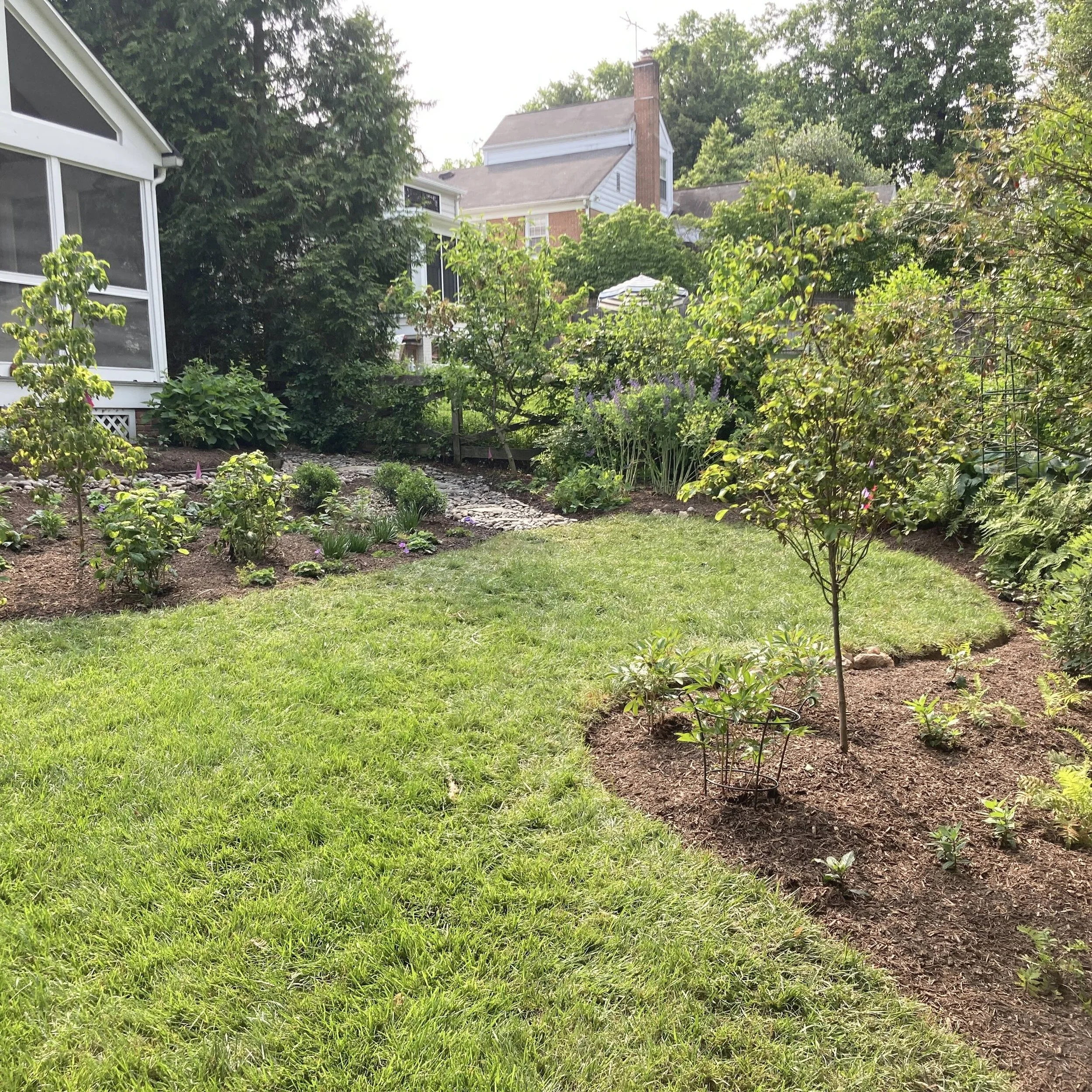 A large pool was removed and filled in by another contractor, allowing us to come in and create a backyard oasis for the client. Invasive plants were removed and pollinator gardens were established for a colorful scene throughout the growing season. In addition, sod and stepping stones were placed to allow for recreation.