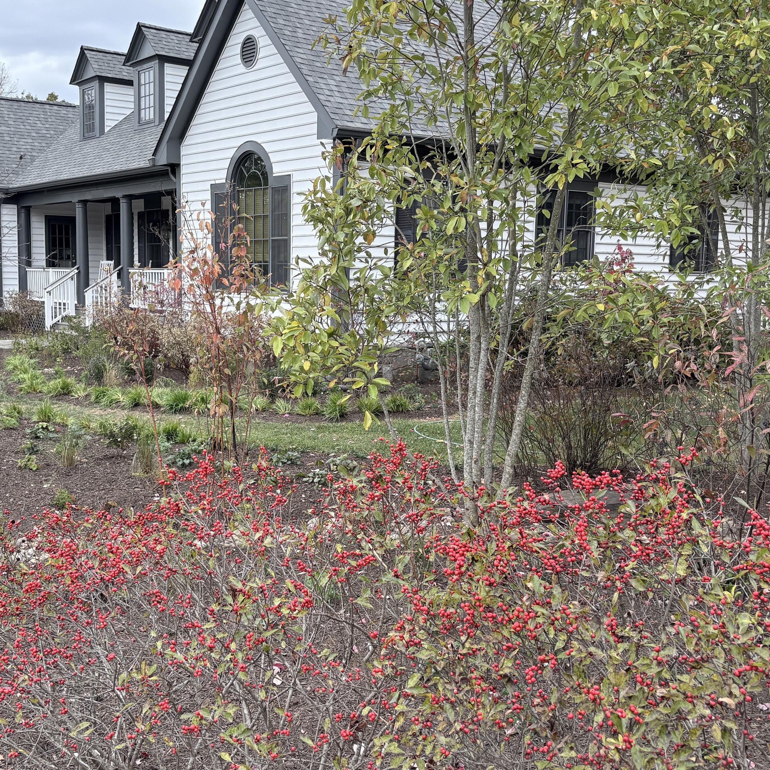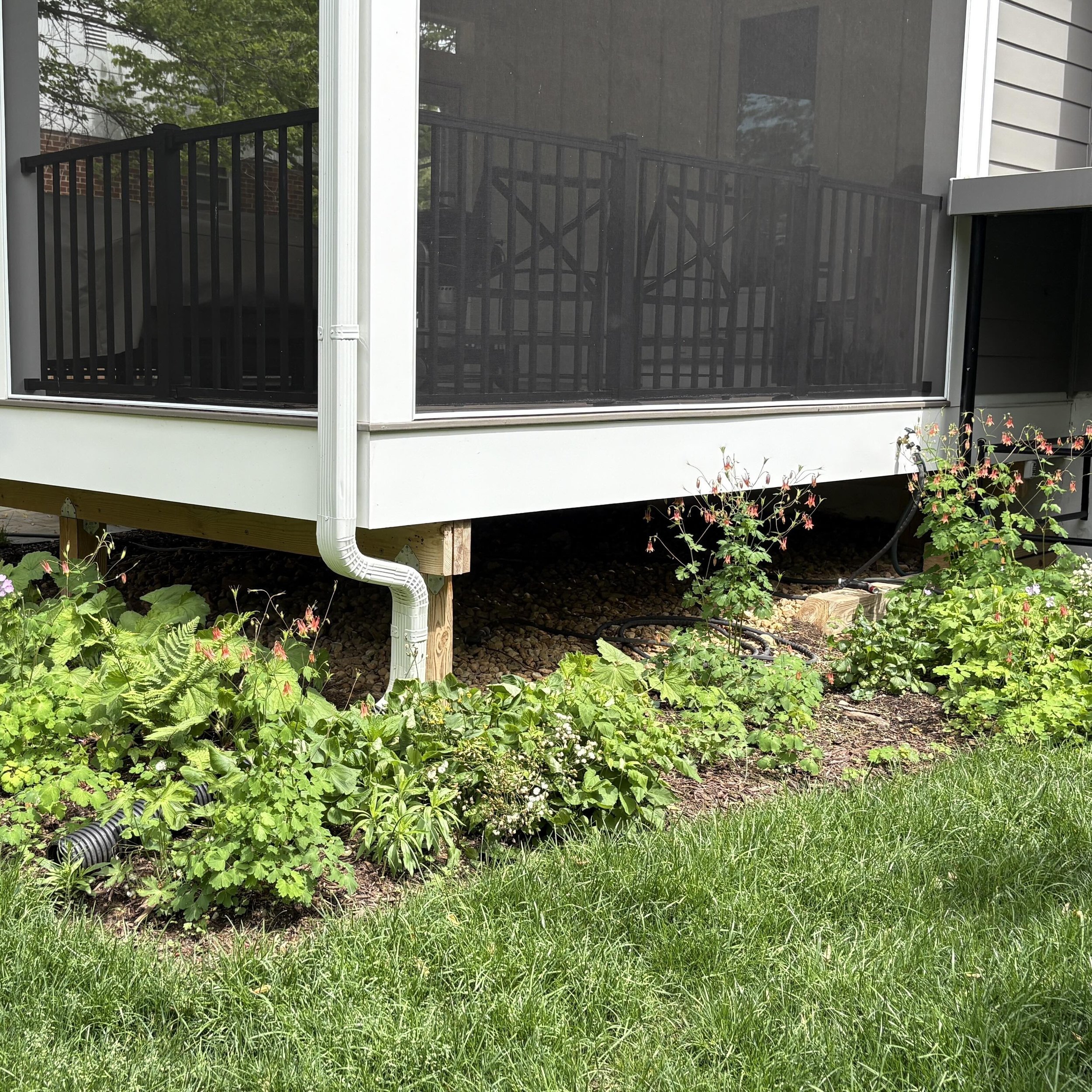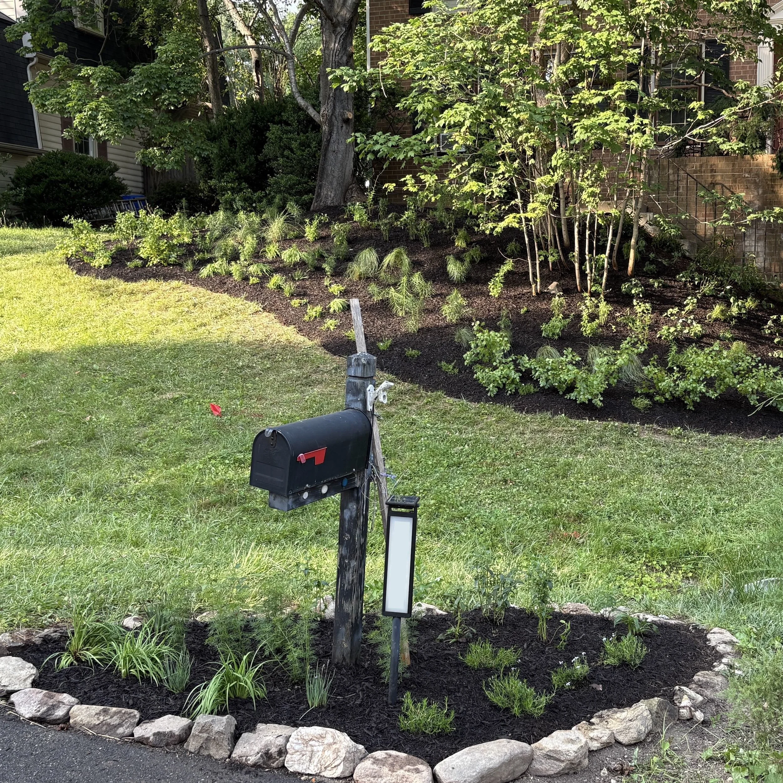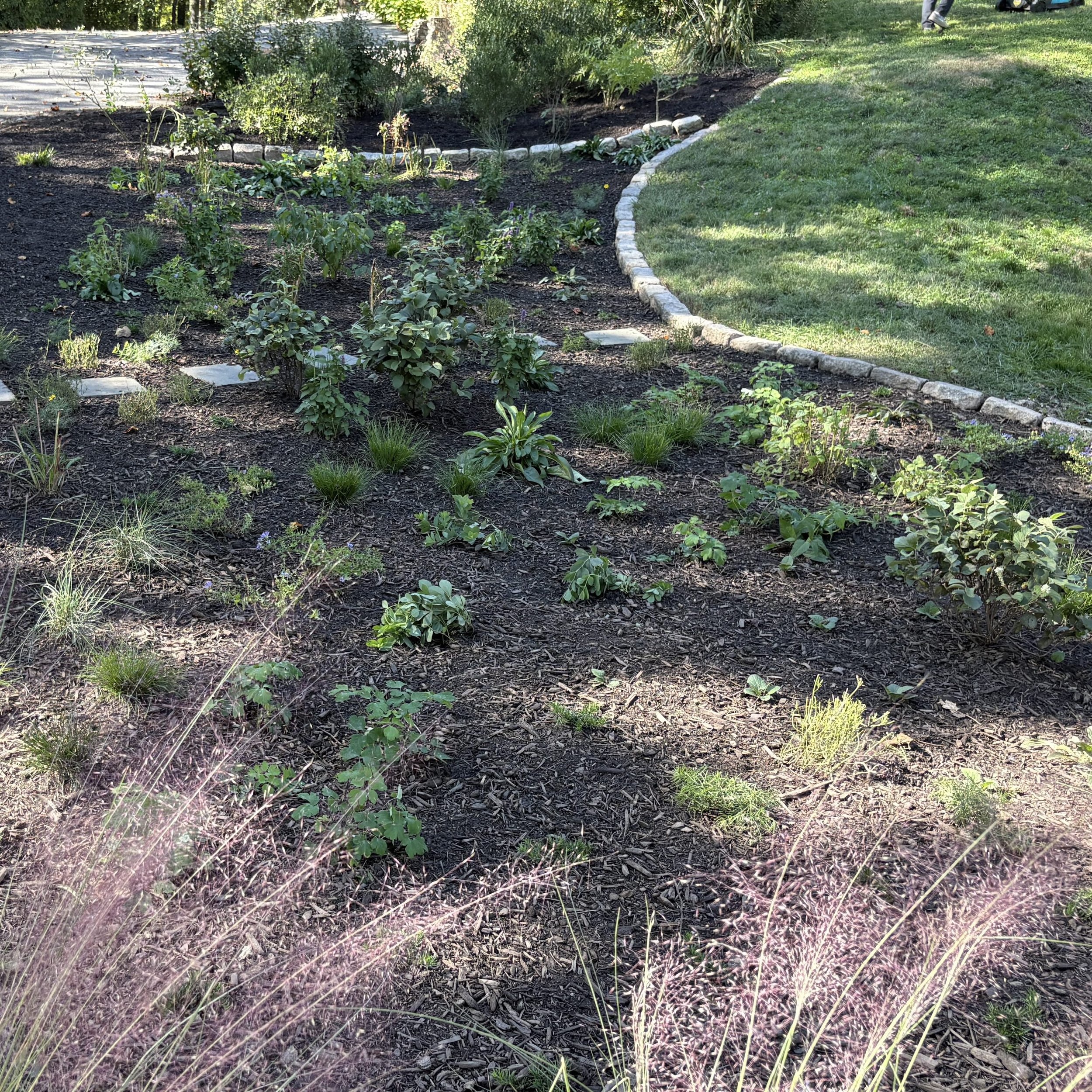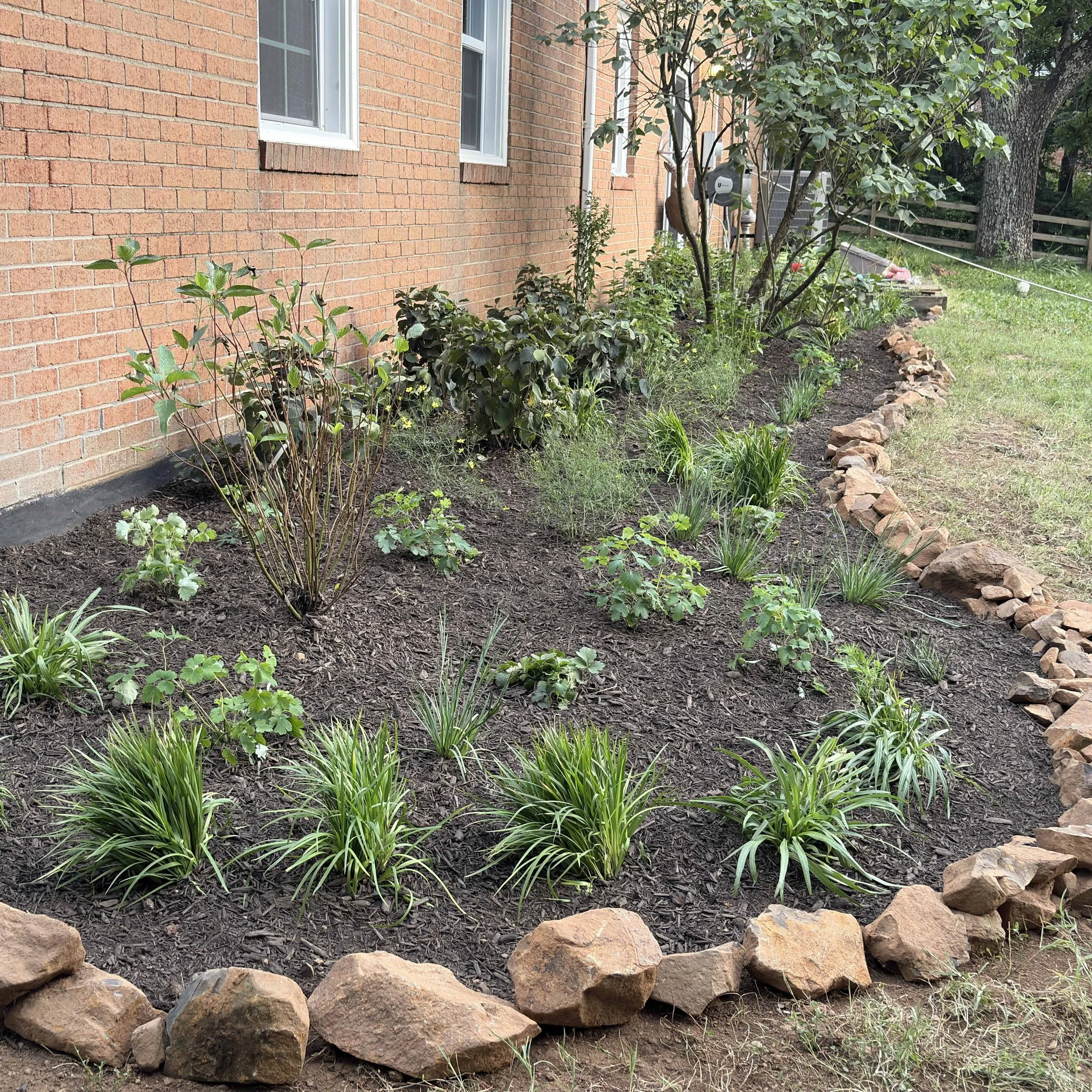 Native Plants were planted bordering the home to create a low maintenance garden bed. Buried rocks were repurposed to edge the new bed.
