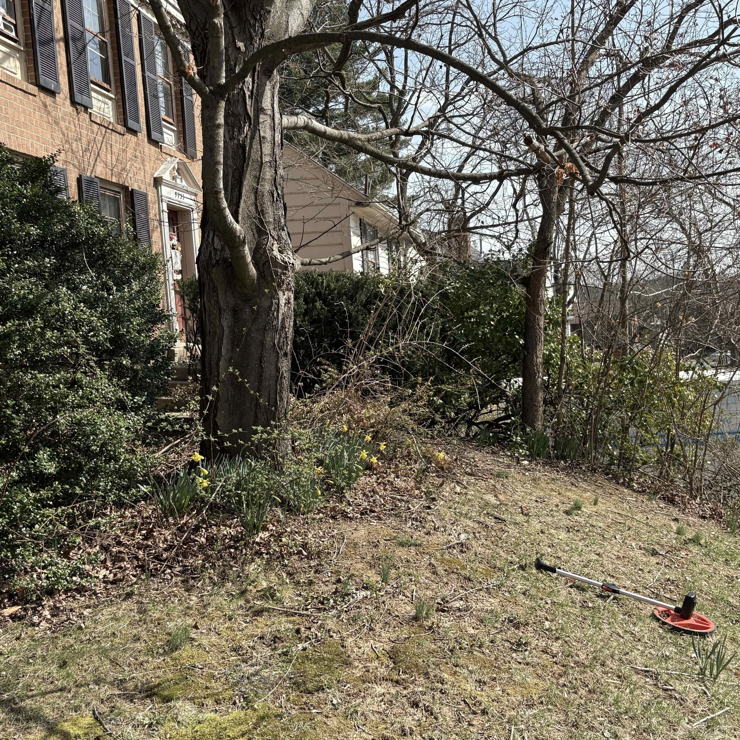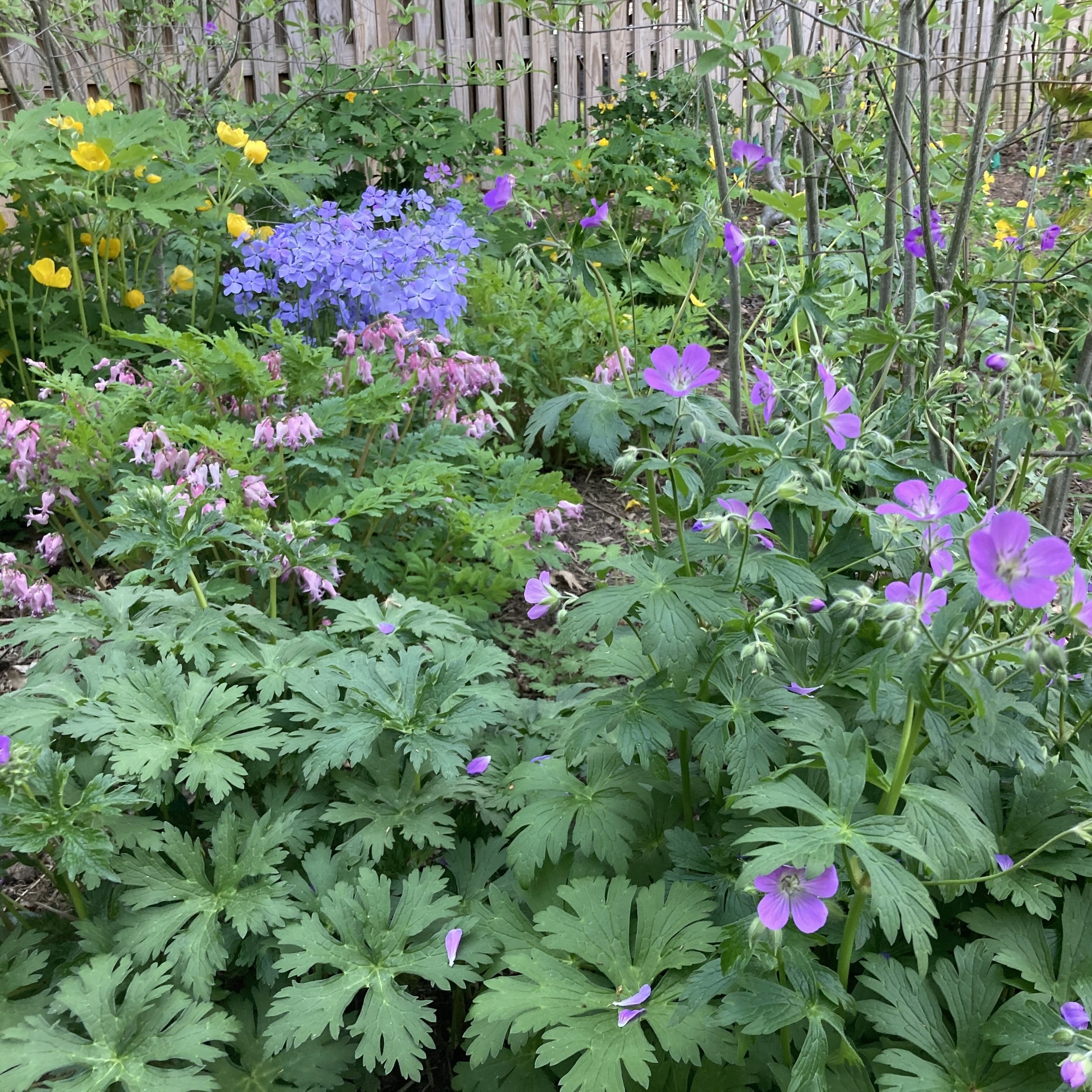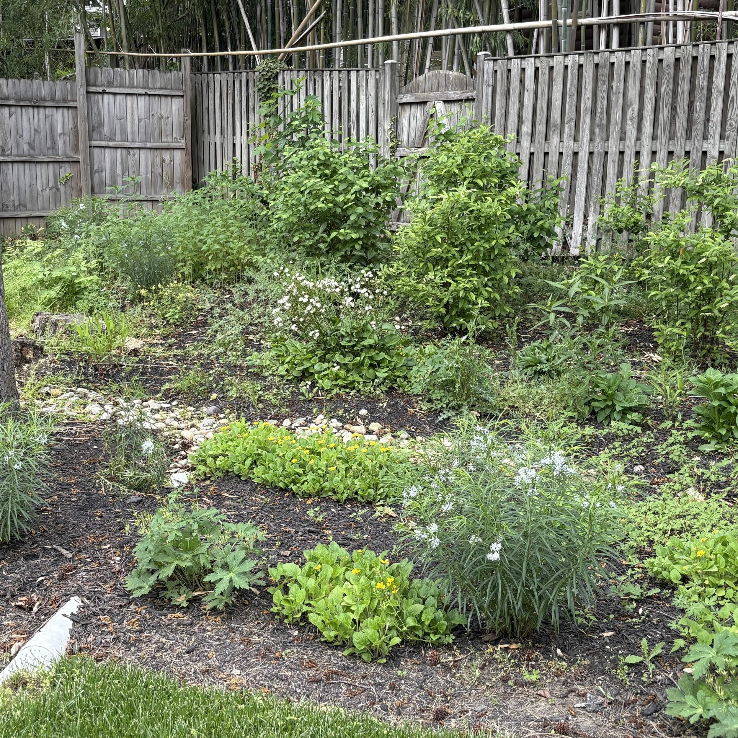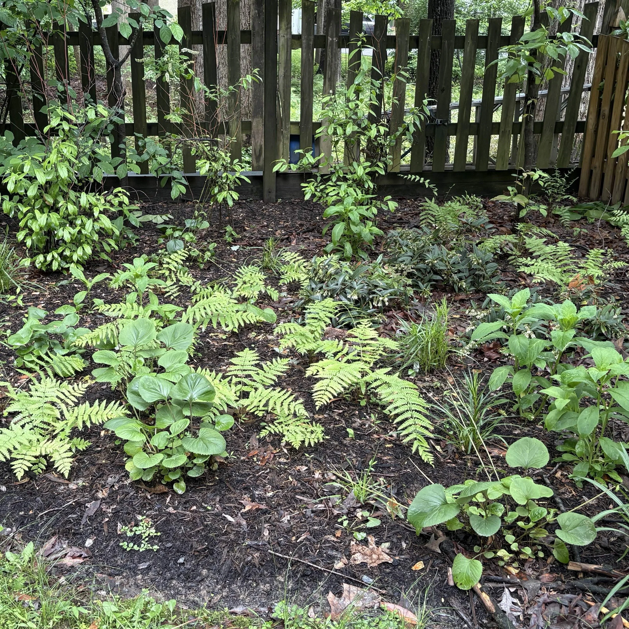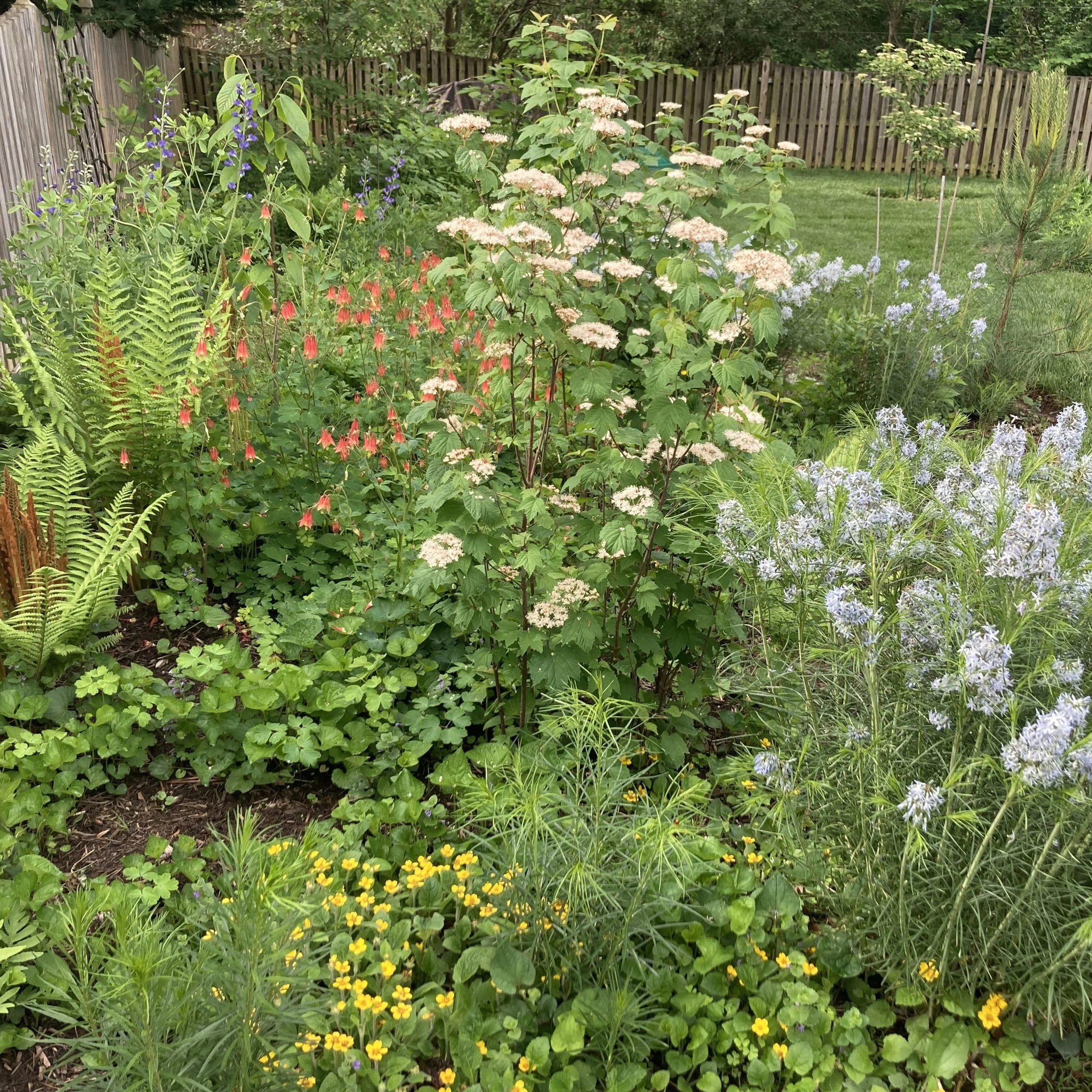 We added topsoil to a corner of this yard to alleviate the heavy clay. After, we planted a bunch of spring ephemerals that brighten up the space before other plants are blooming. We were also able to sustainably source some rare, threatened, and endangered plants.