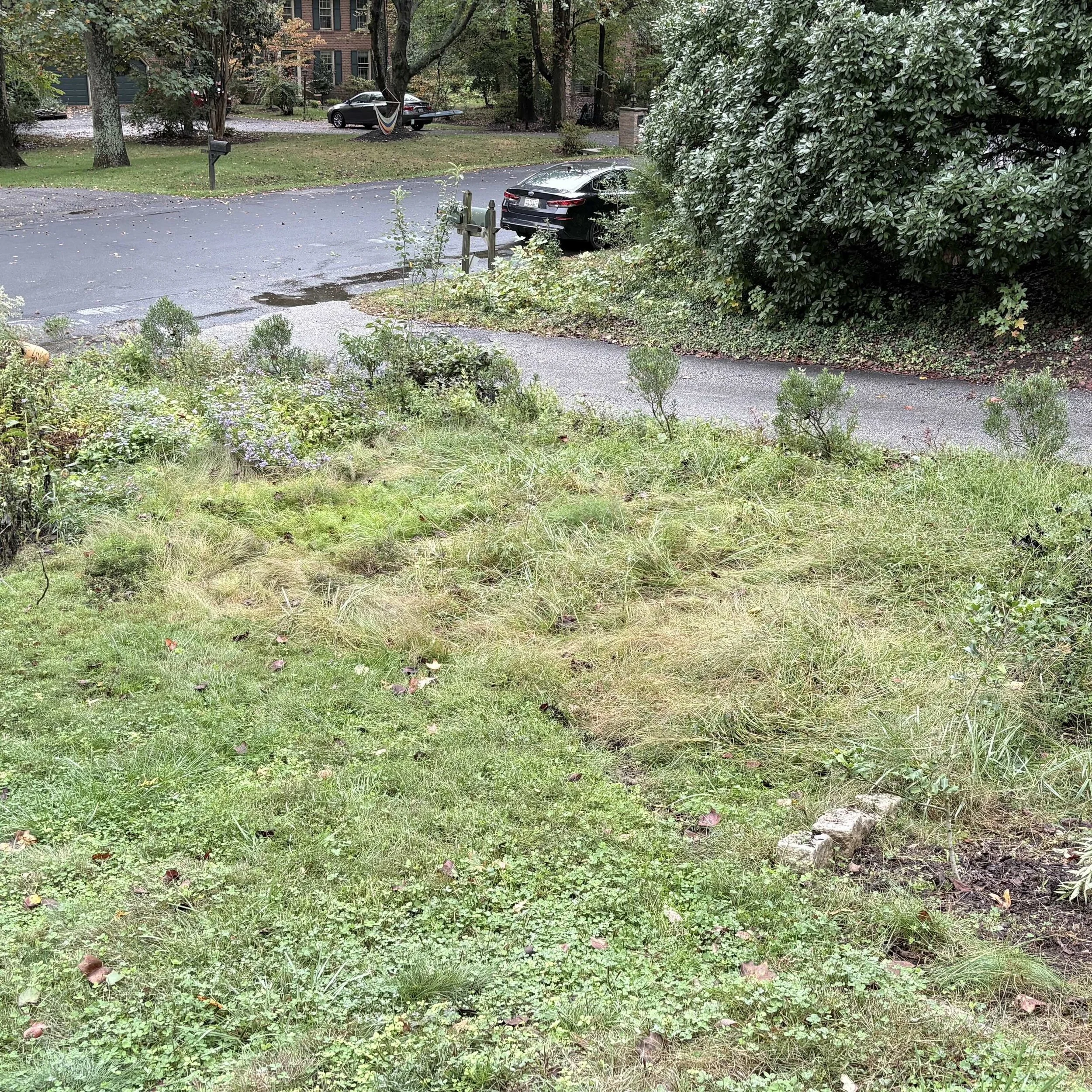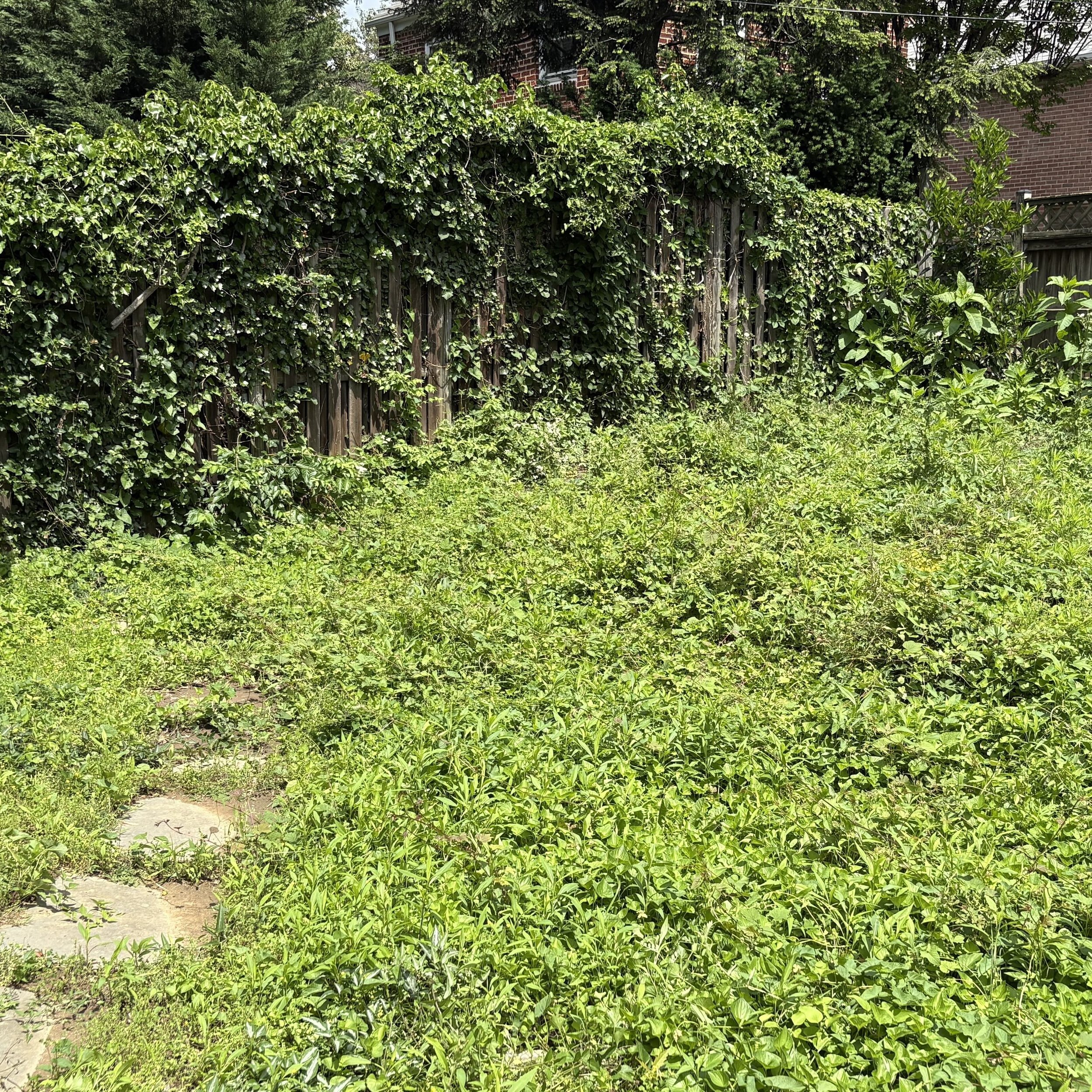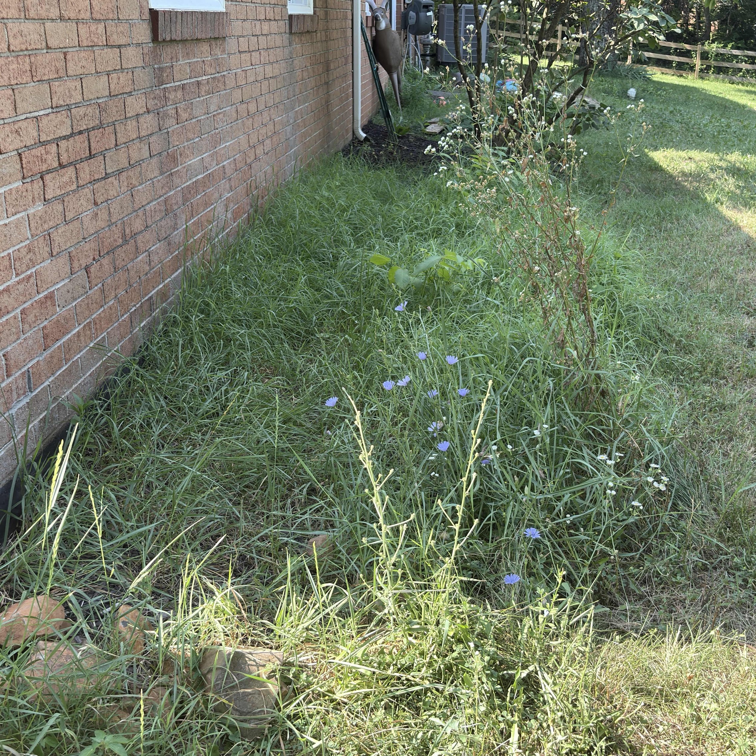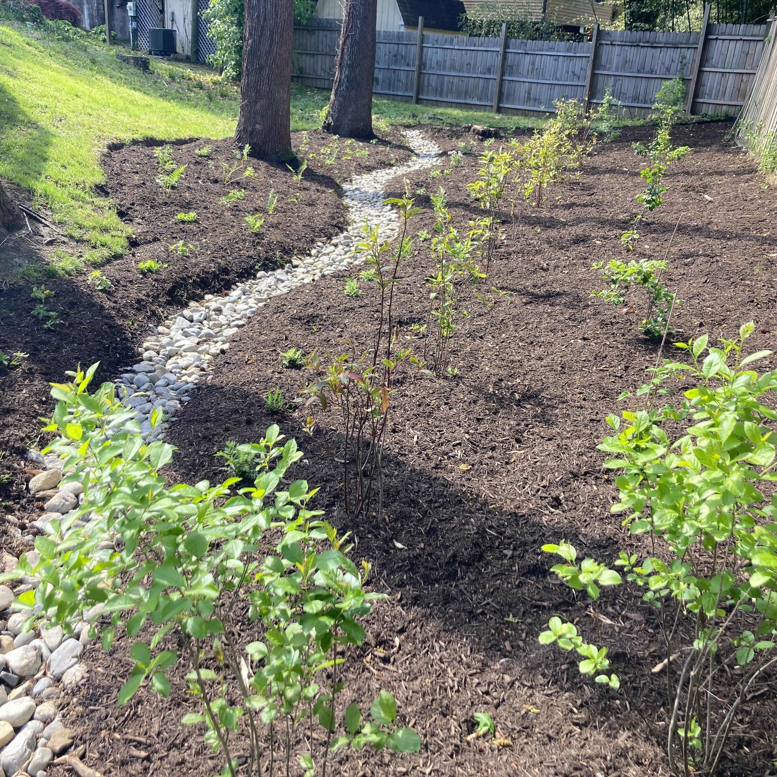 This client's backyard had become completely overrun with weeds and invasive vines, with many weeds being over 6ft tall. All unwanted vegetation was cleaned up and hauled offsite, and over 300 native plants were planted to create a conservation landscape. Stormwater runoff would move towards the house so this was addressed with the plants and a layer of river rock.