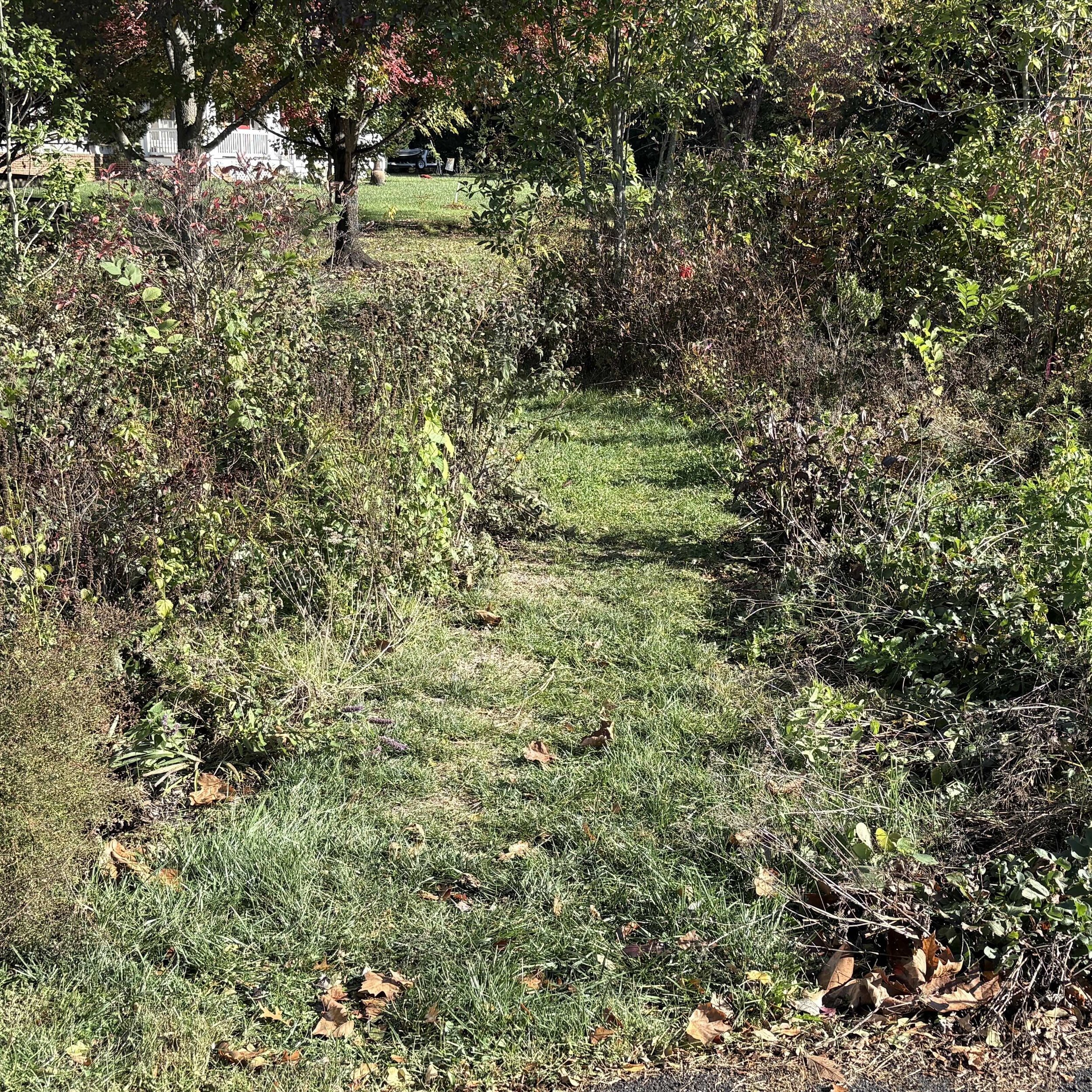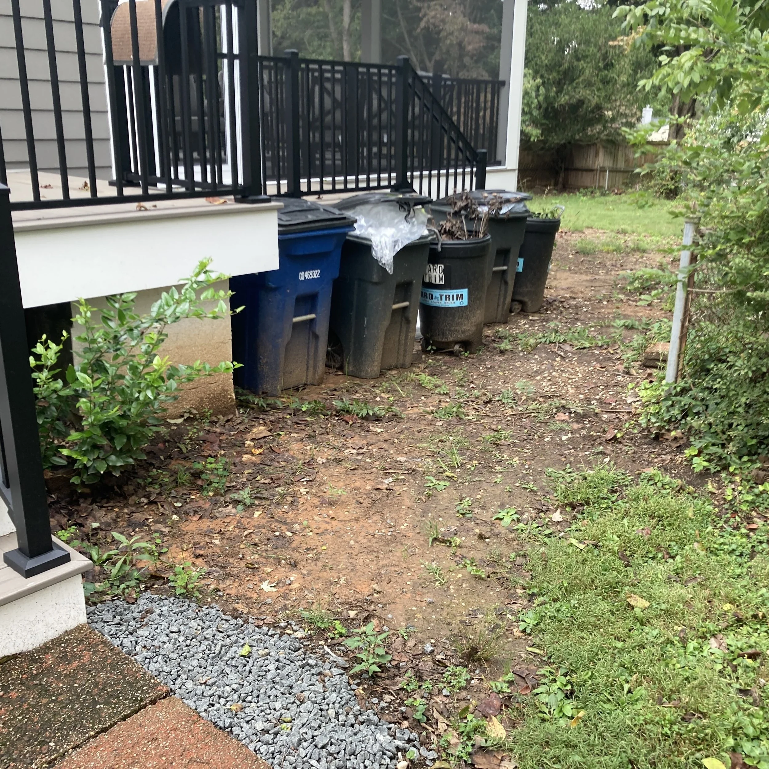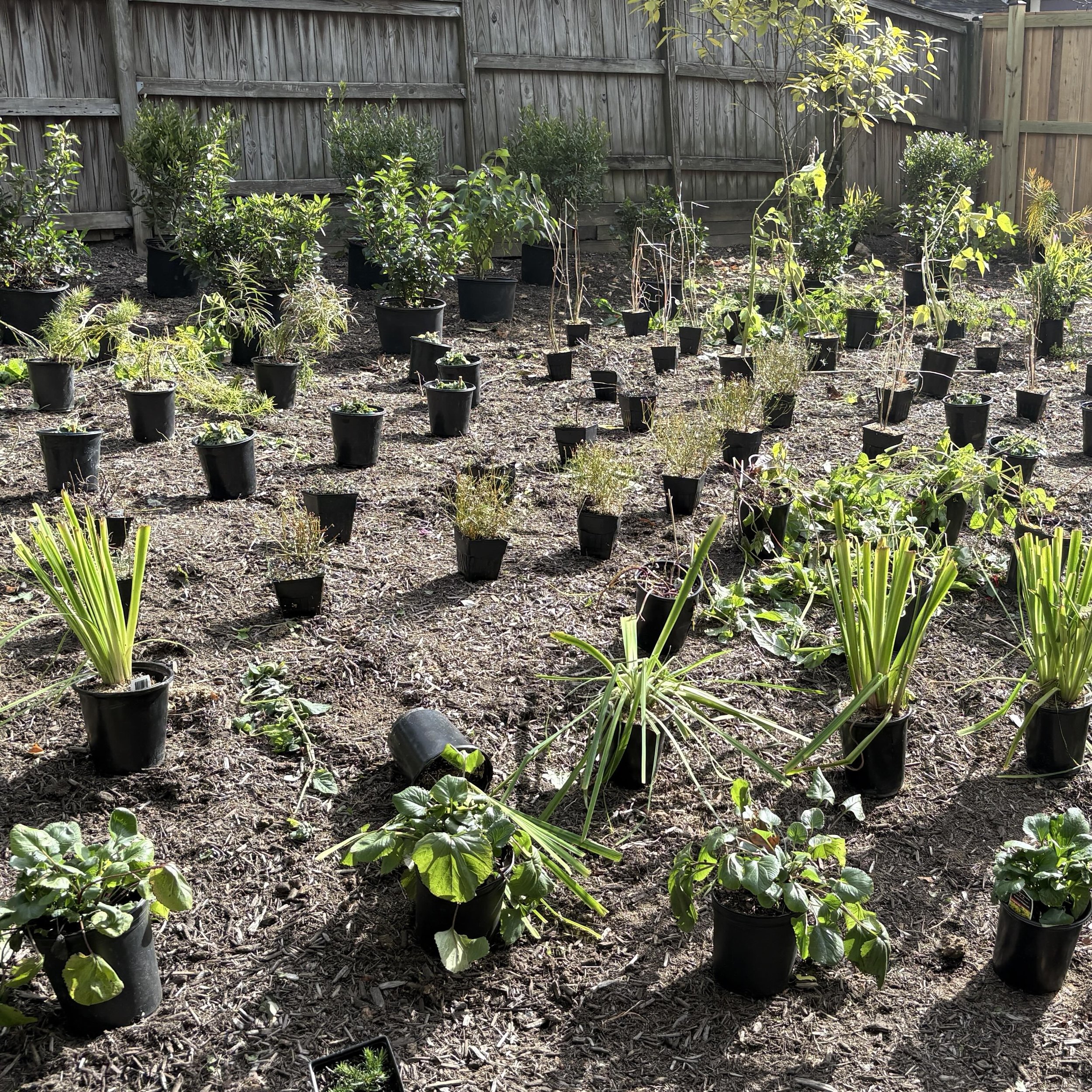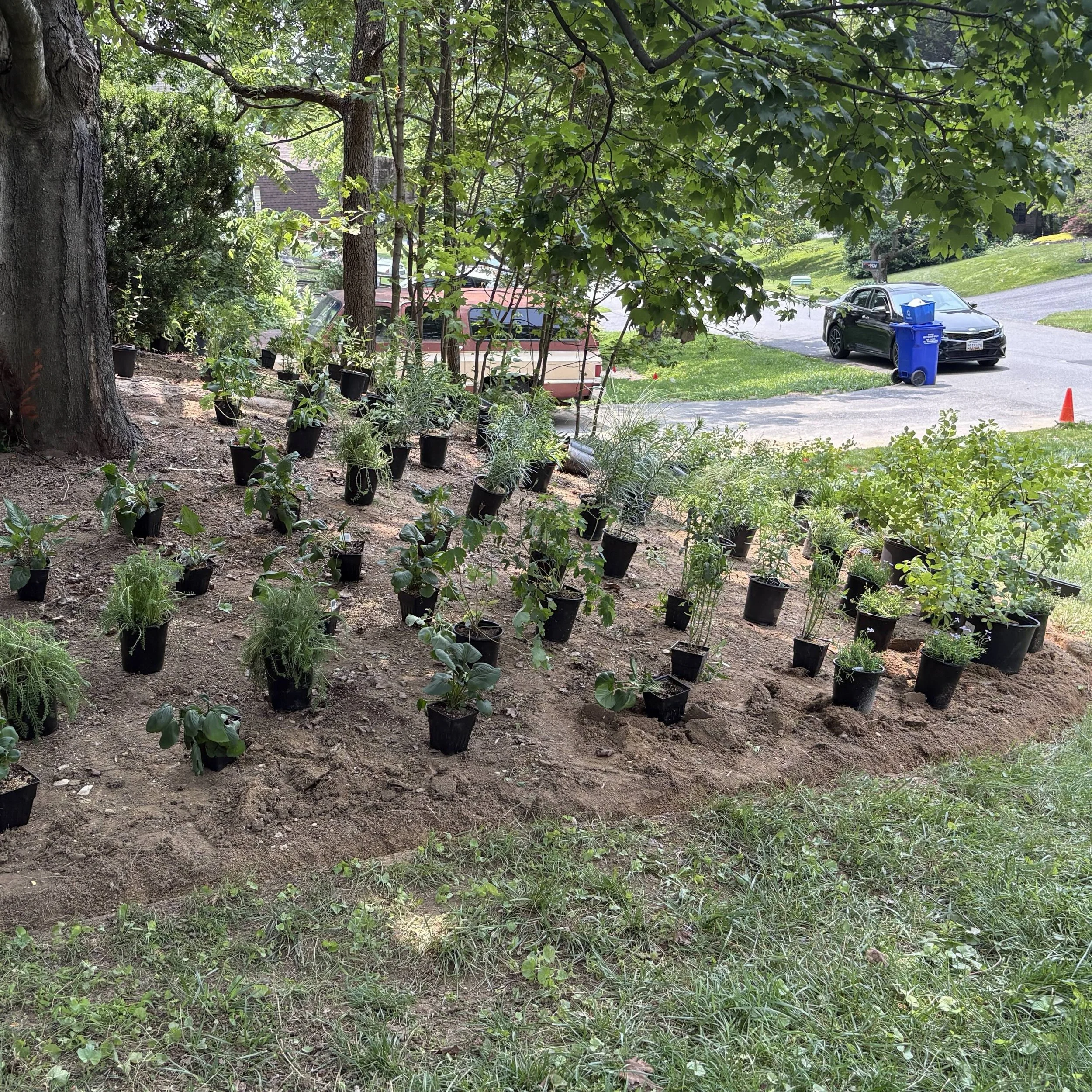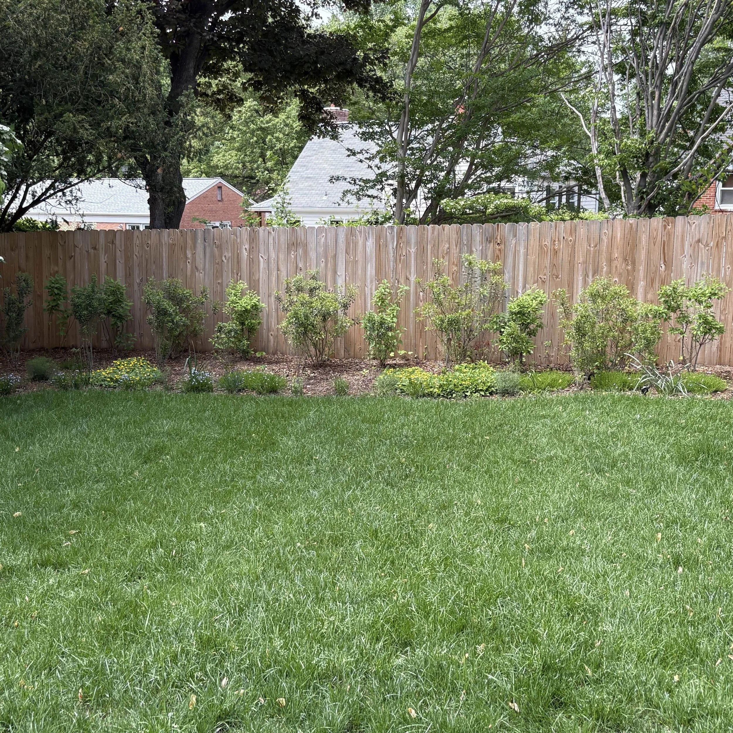This client's backyard had become completely overrun with weeds and invasive vines, with many weeds being over 6ft tall. All unwanted vegetation was cleaned up and hauled offsite, and over 300 native plants were planted to create a conservation landscape. Stormwater runoff would move towards the house so this was addressed with the plants and a layer of river rock.
