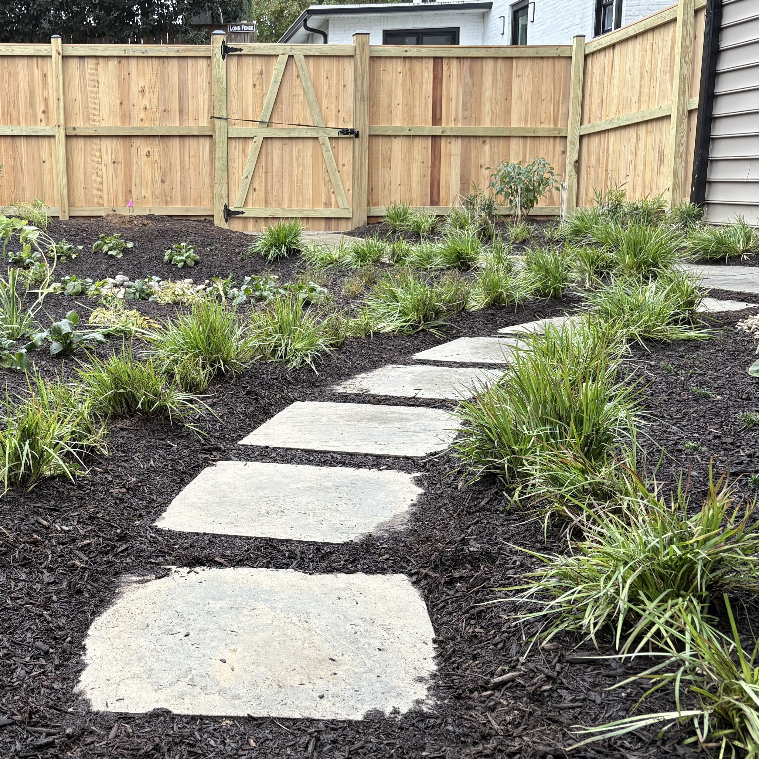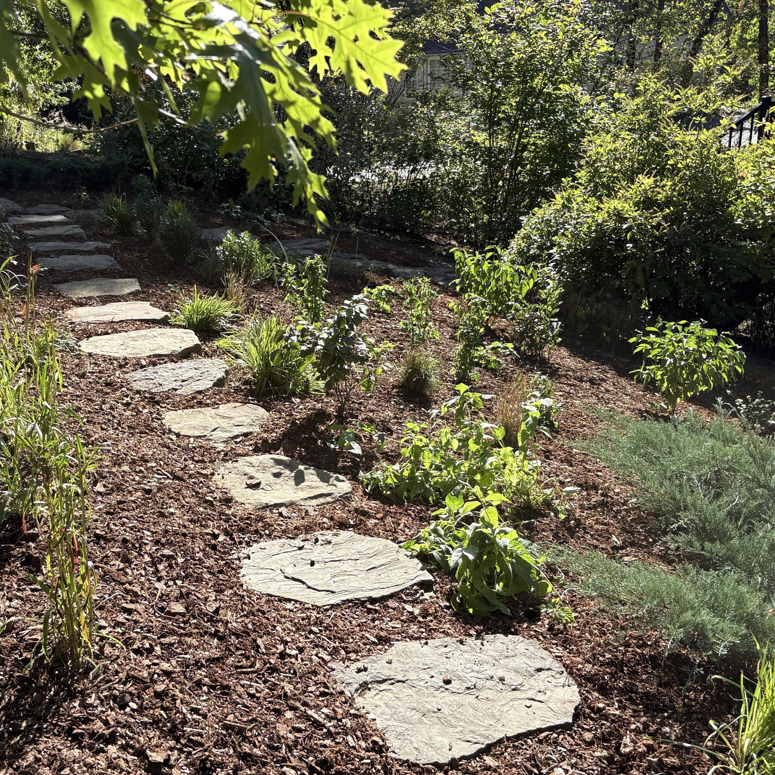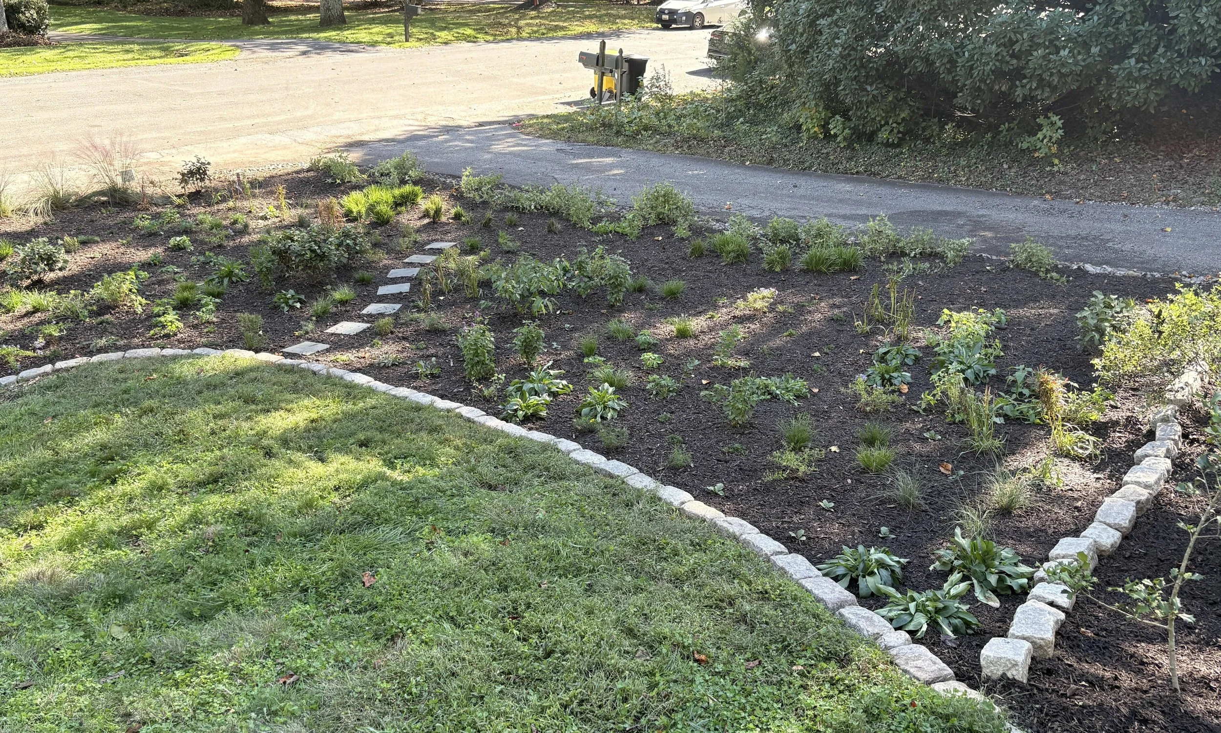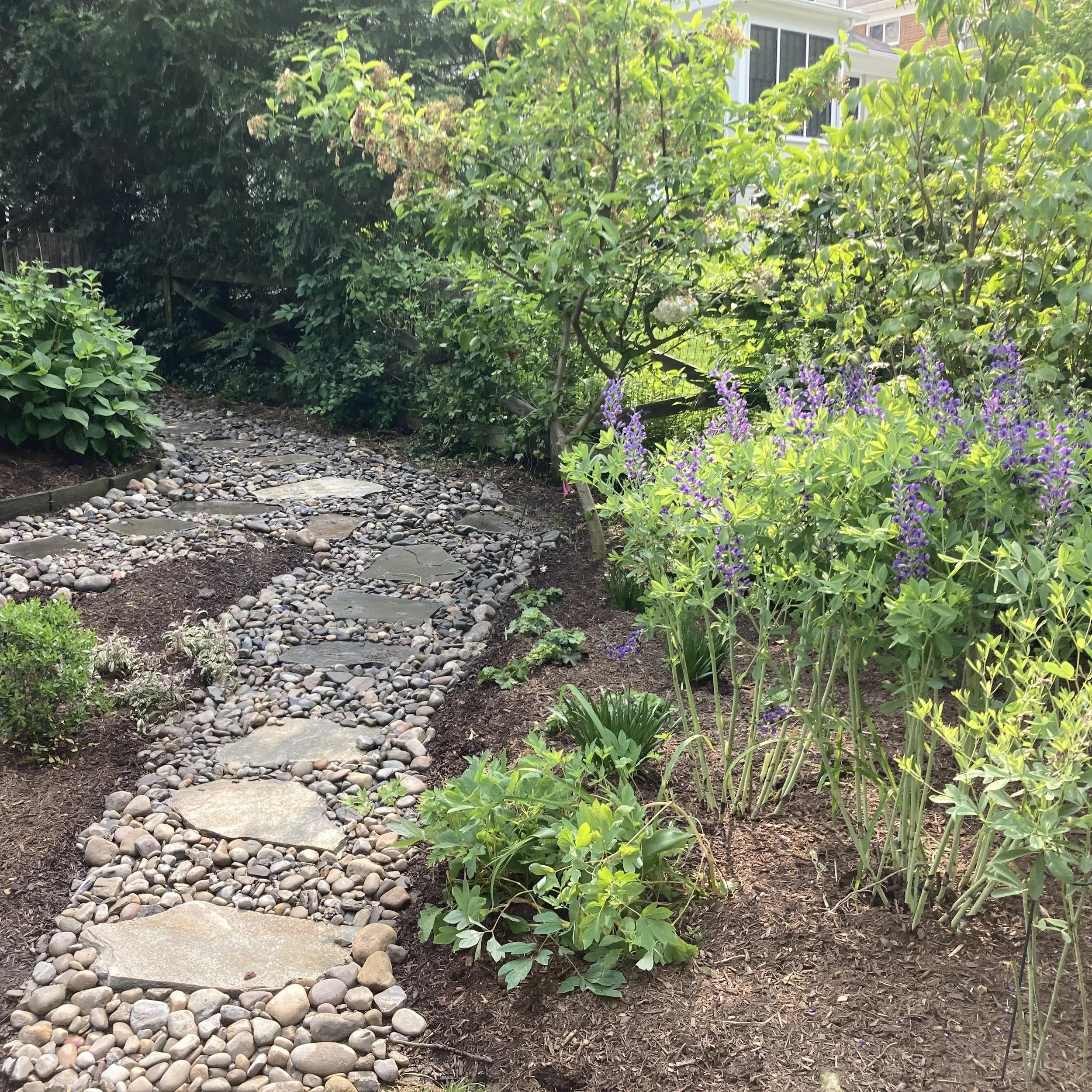 The client was unhappy with the large patches of liriope - it was spreading in unwanted areas and didn't offer much in the way of beauty. We removed this non-native groundcover and replaced it with a variety of colorful flowering perennials, most of them native. We also established a stone walkway set in river rock for safe and easy access down the sloped side yard.