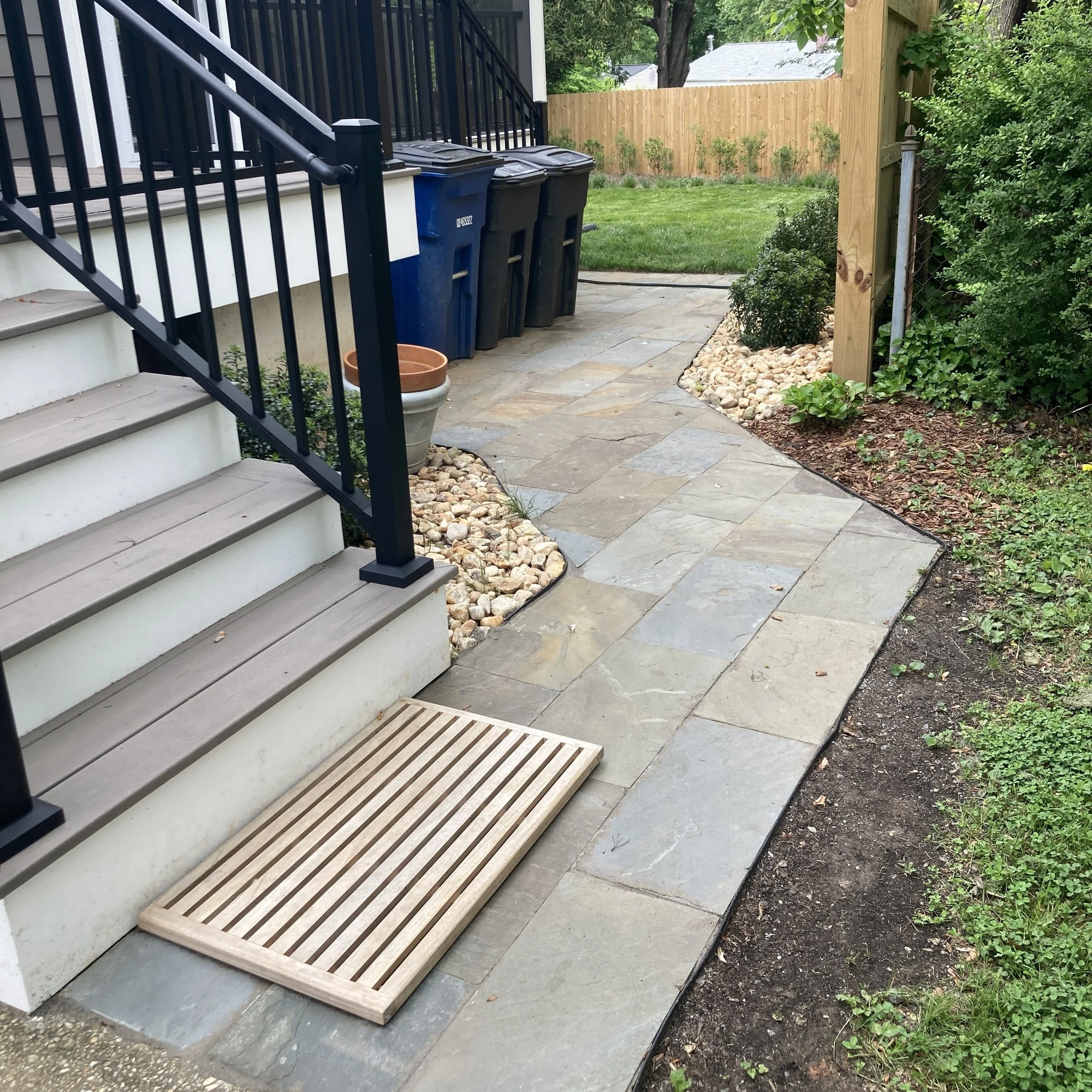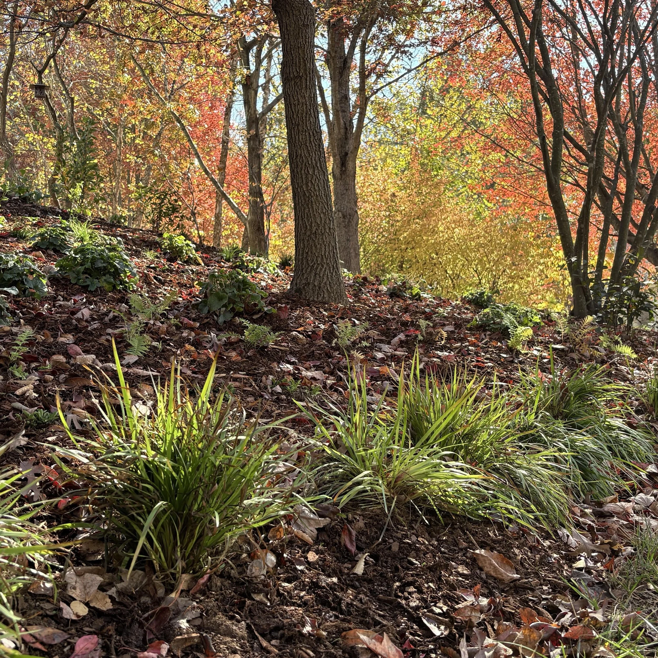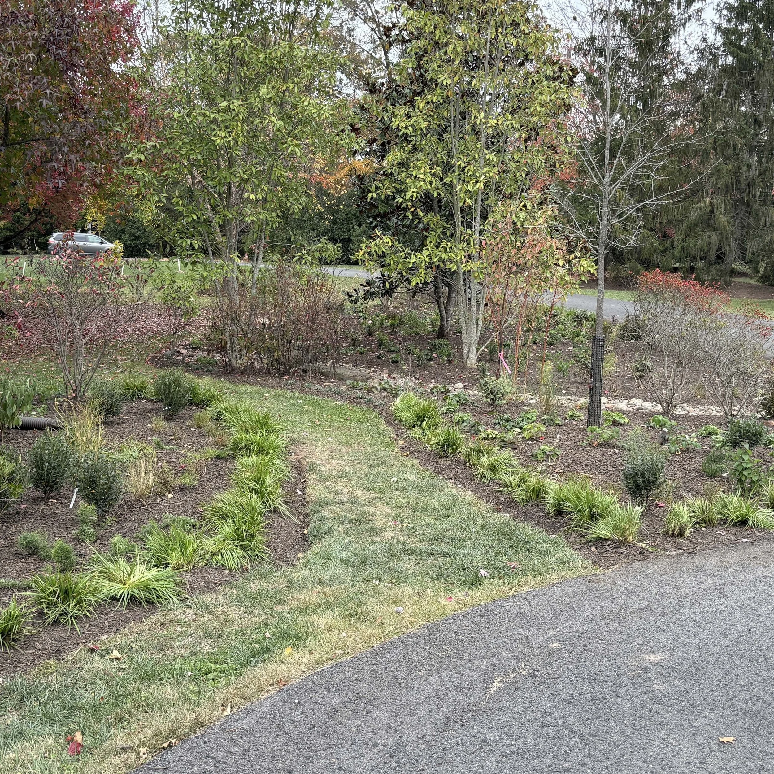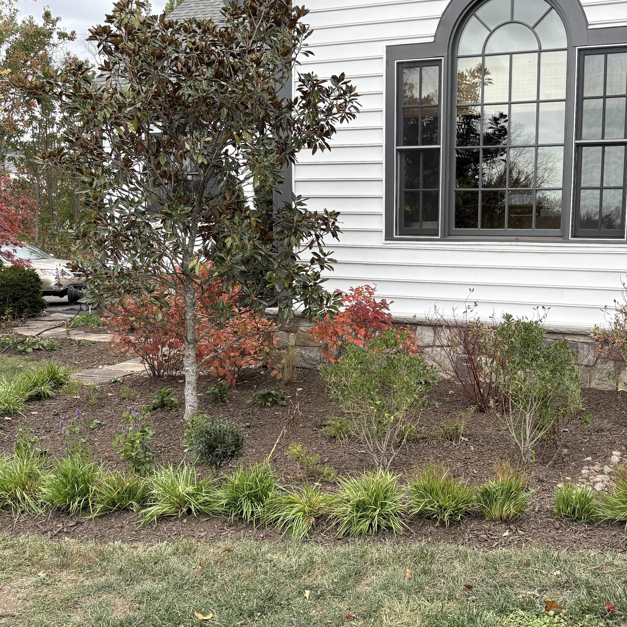 The client was unhappy with the large patches of liriope - it was spreading in unwanted areas and didn't offer much in the way of beauty. We removed this non-native groundcover and replaced it with a variety of colorful flowering perennials, most of them native. We also established a stone walkway set in river rock for safe and easy access down the sloped side yard.