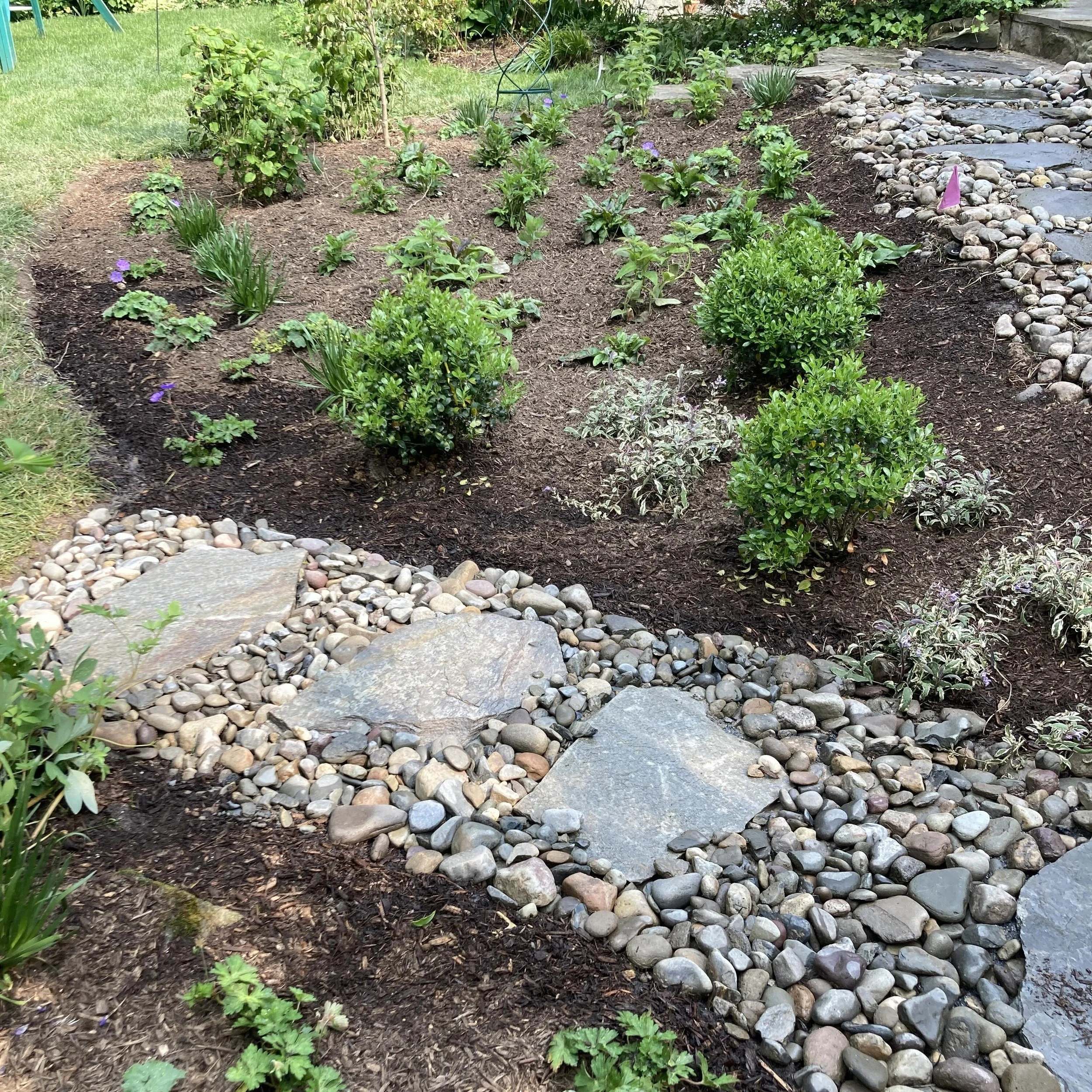 Homeowner is really passionate about native plants and was looking to create a garden that would be appealing not only to them but to the local wildlife. This area can now support an abundance of beneficial creatures and has a variety of bloom colors, times, and textures. The river rock swale is a subtle feature to help redirect rainwater from their downspouts