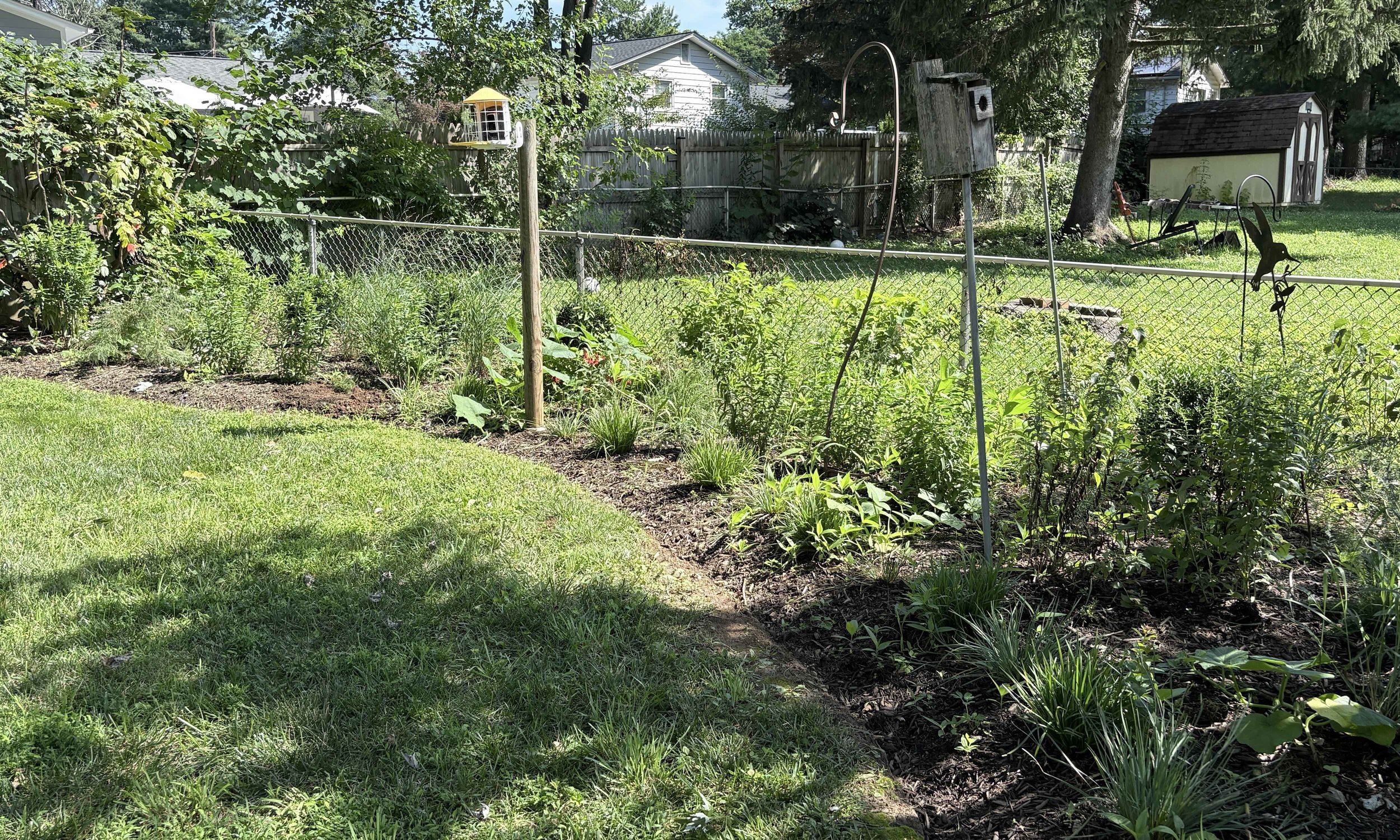 Invasive ornamental grasses were becoming a nuisance and were removed. Client wanted to add some color and variety of texture while also allowing a space for the local wildlife. Over 100 species of wildlife have been documented visiting the garden, including many birds, butterflies, bees, caterpillars, and other insects.