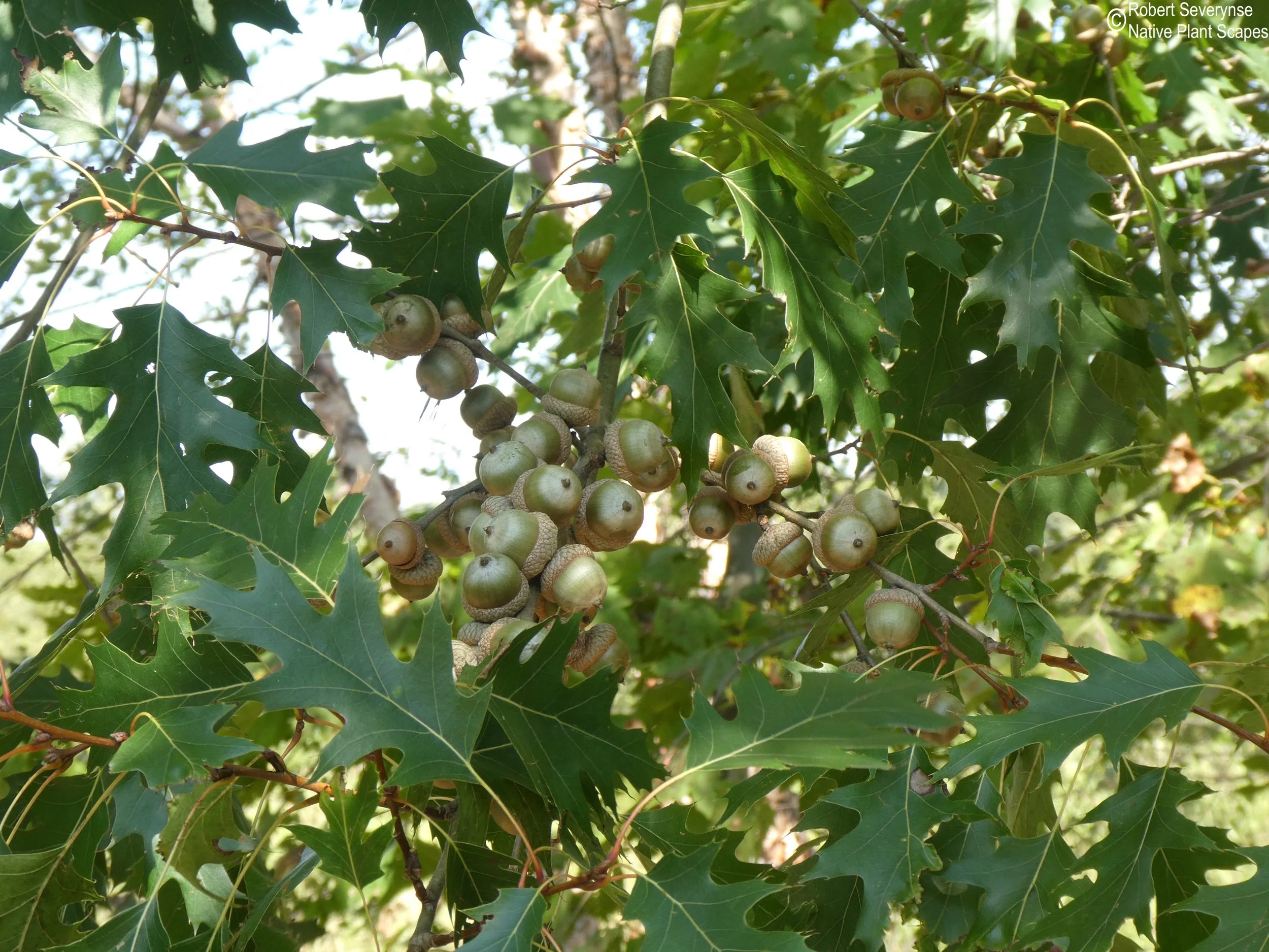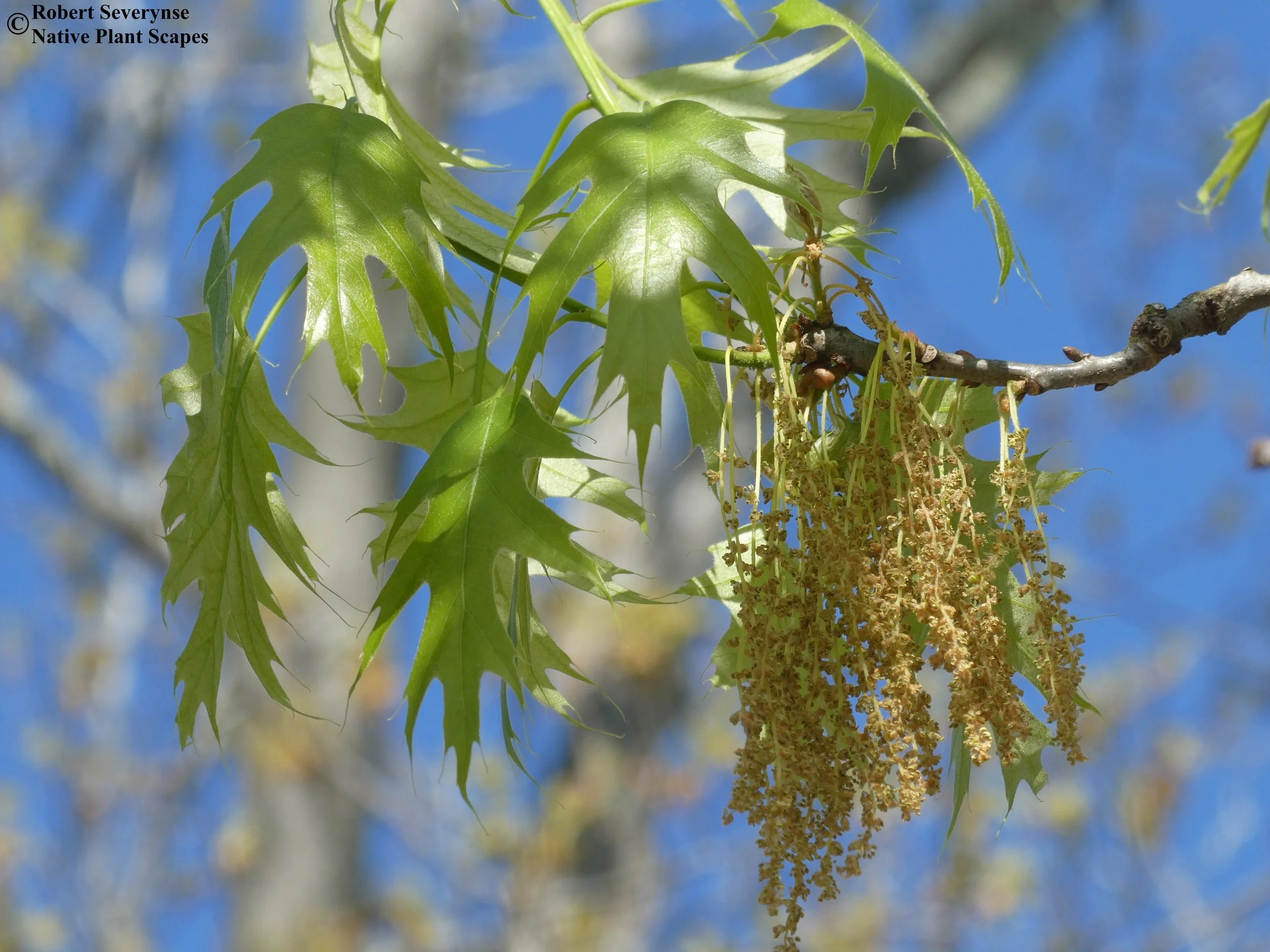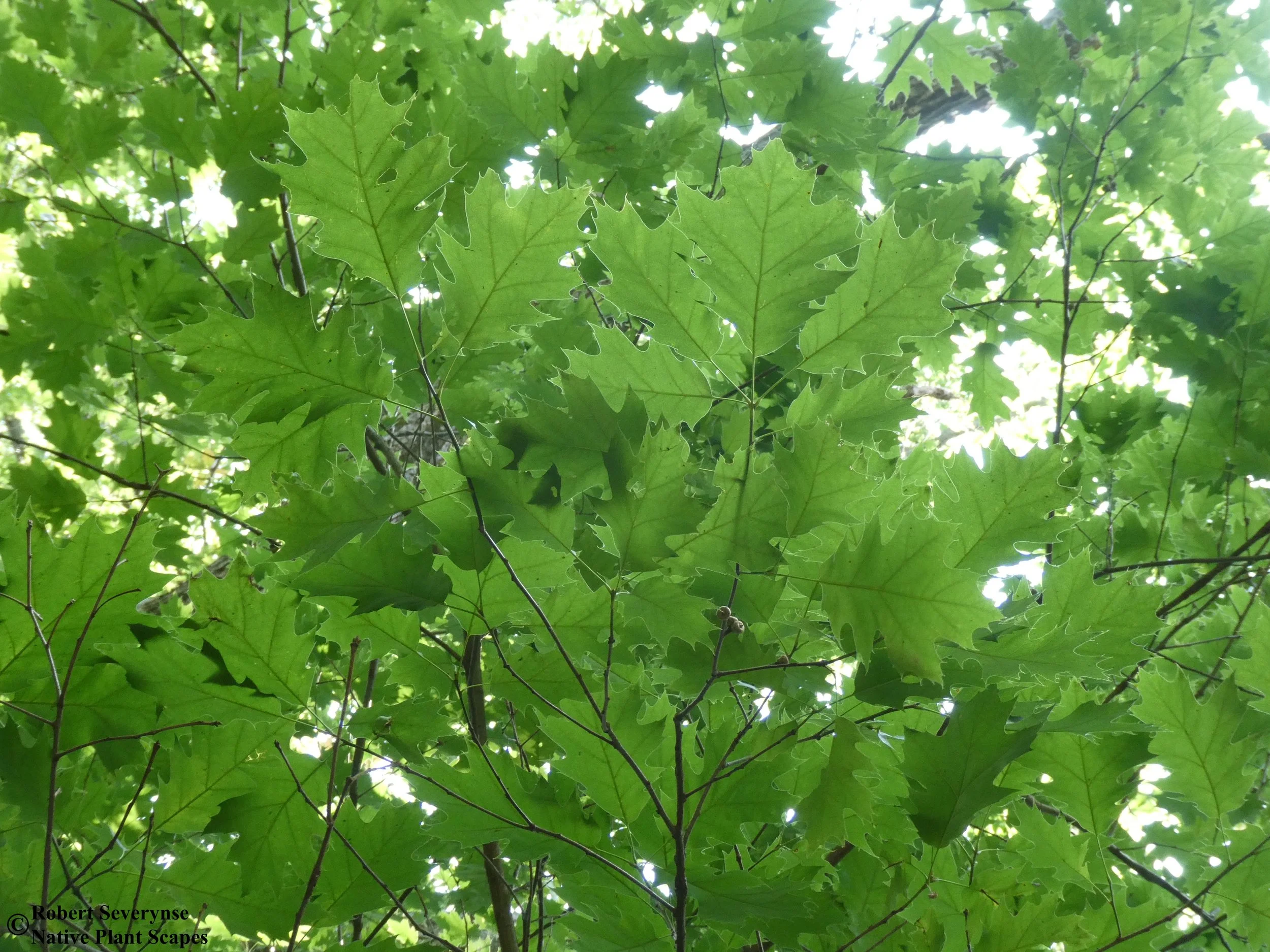 Northern Red Oak acorns are an important food source for many birds and mammals. Other parts of this tree are eaten by various mammals (Dried leaves, saplings and young shoots eaten by deer, twigs eaten by rabbits and beavers, and bark eaten by porcupine). Trees offer habitat, cover, nesting sites, cavities, and protection for a variety of wildlife. Birds and mammals use twigs and leaves in nest construction, and may perch on the branches. Since leaves can persist more than many other plant species in some areas, young oaks may provide brushy winter cover. These persisting leaves are used by some insects to lay their eggs. Catkins can attract pollinators in the spring. Larval host that supports 557 species of caterpillars.