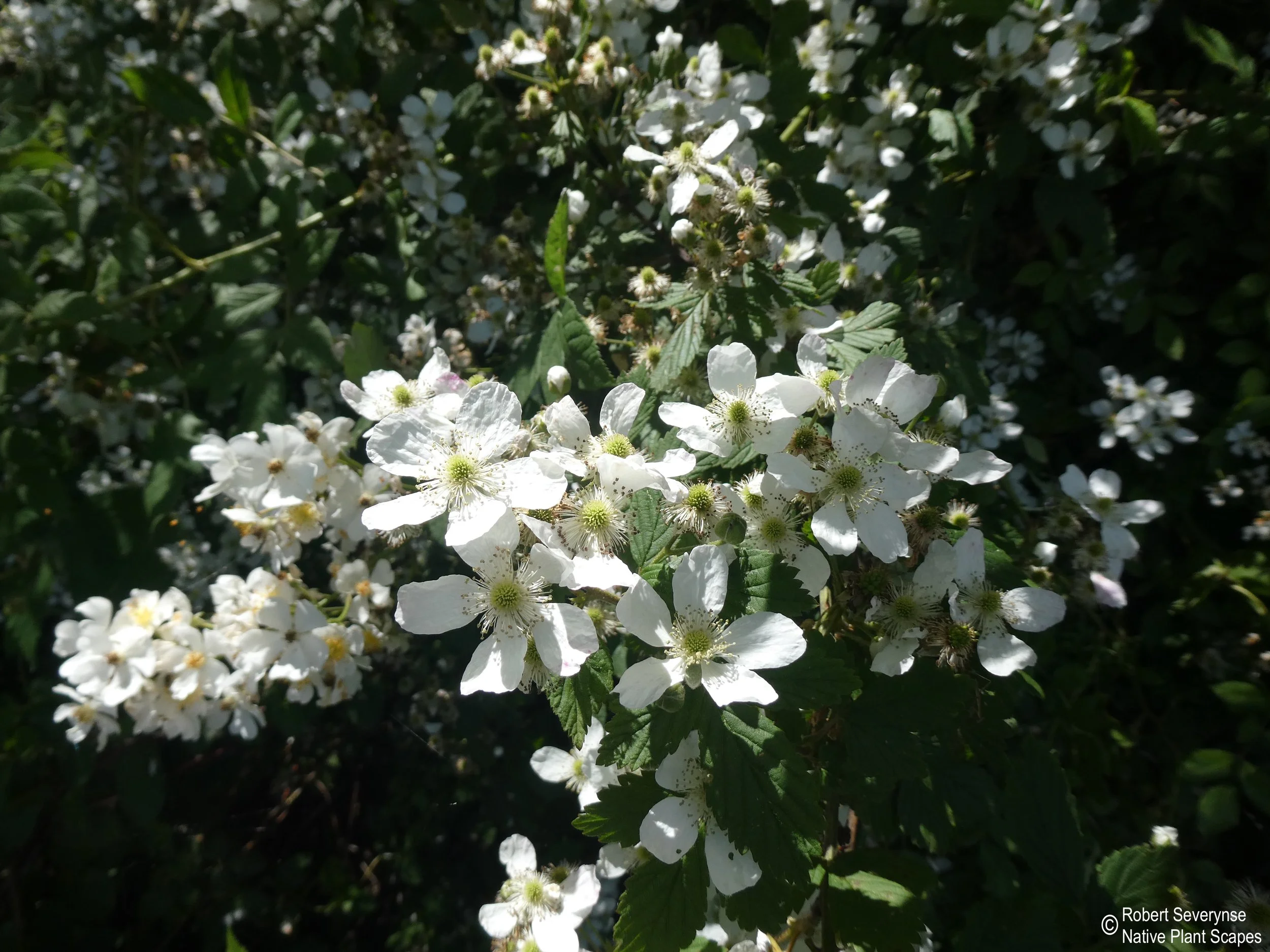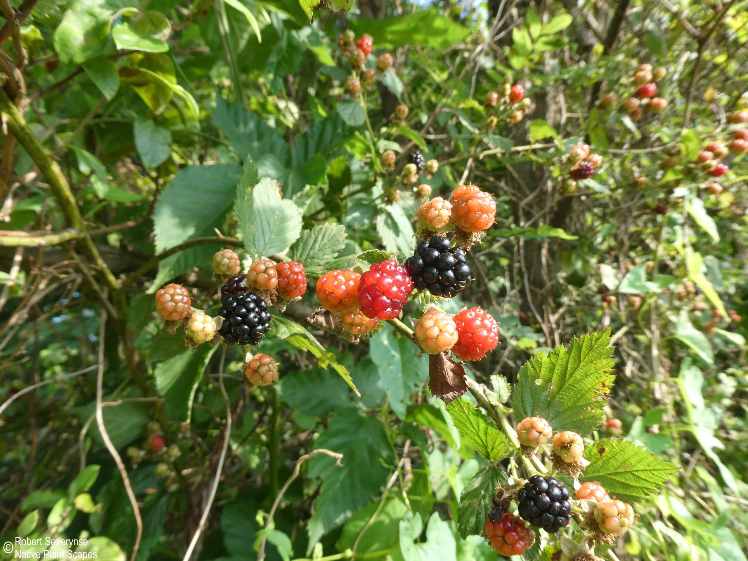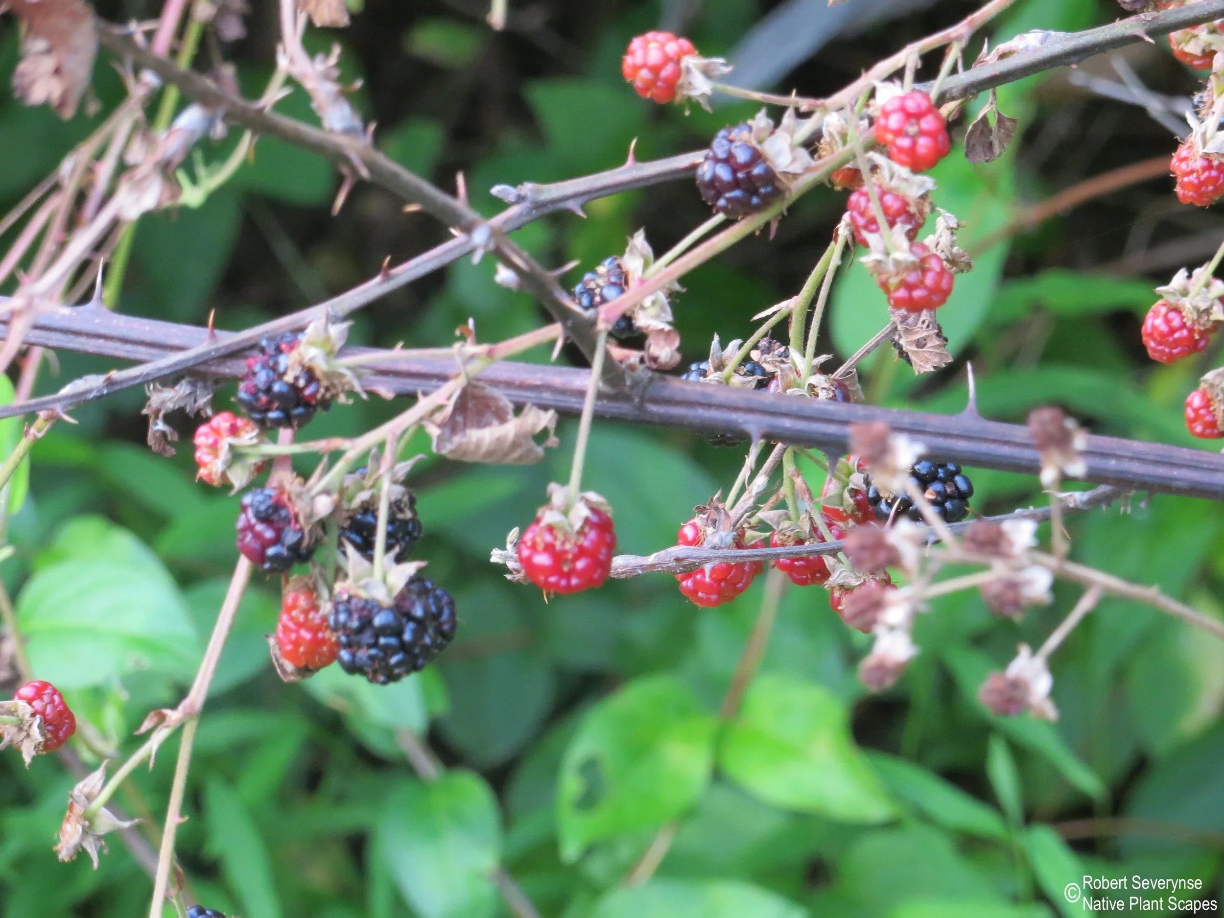 Allegheny Blackberry flowers are a pollen and nectar source to a variety of pollinators. An abundance of wildlife eat the blackberries and seeds. Dense stands create year round cover and nesting sites for birds and smaller mammals. Leaves are a larval host for several species of caterpillars. Bees overwinter in the canes.